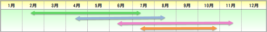 | 播種期 | 定植期 | 収穫期 | 出荷最盛期 |