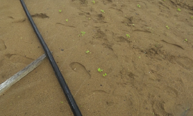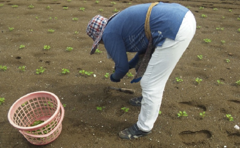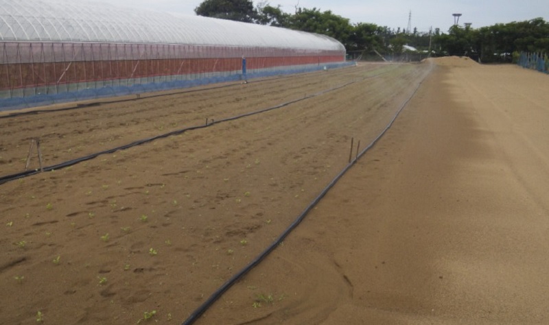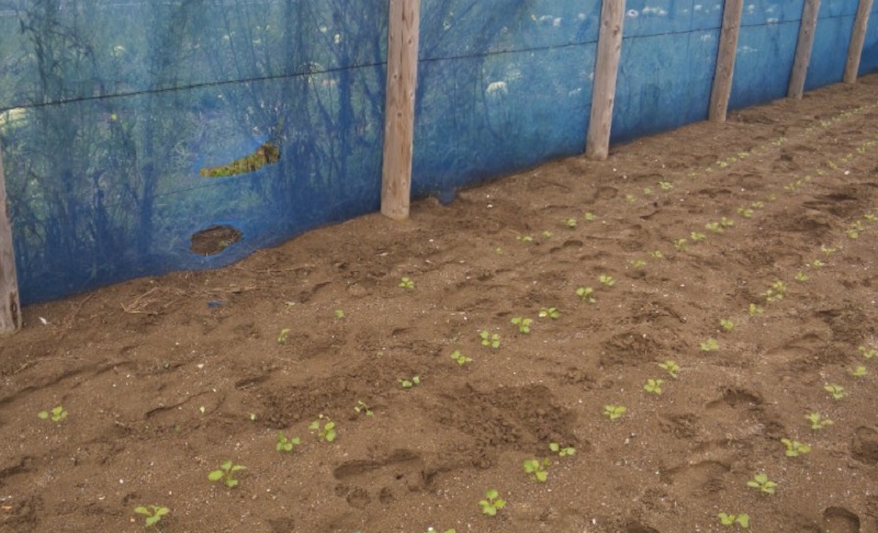 あった。…本年は無いことを願う。 《1、2枚目》 ・播種の様子(今、始めたばかり)。 ・播種後左側の草は、暴風草(風害防止のために敢えて育てている)。 《3枚目》 ・芽が出た苗の間引き作業(近景)…苗の間隔が狭いと、大きな実に育た ない。 ・ 間引きした苗は籠の中へ入れ廃棄。 《4枚目》 ・同じく間引き作業(全景) ・写真の左側は18日播種、右側は24日播種。 《5枚目》 ・苗の大きさ比較 (別添2圃場分…18日播種)。 《6枚目》 ・猪により破られた防護ネット(同じく別添2圃場分)。 《7枚目》 ・灌水チューブによる圃場散水(全景)。 《8枚目》 ・同じく灌水チューブによる圃場散水(近景)。 | ||||||