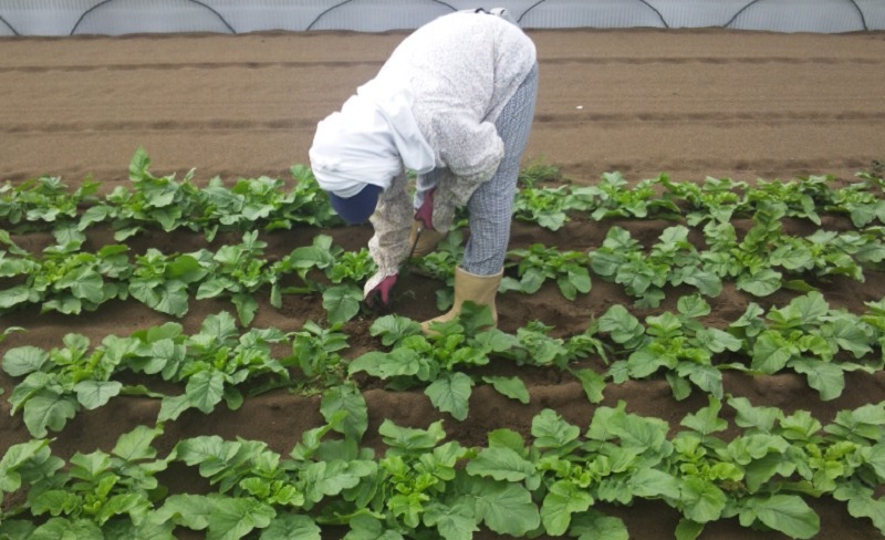 わかりやすい。 《1枚目》 ・圃場内の雑草を取り除いている様子。 (8月17日播種の圃場) 《2枚目》 ・果実の大きさ比較…生育進度としては概ね良好とのこと。 《3枚目》 ・虫がかじった大根…シンクイムシが付いたとのこと(果実の芯まで かじってしまう)。 ・後程、この大根は取除いてしまう。 《4枚目》 ・畝を施した圃場。 ・後方で、追肥を施している様子がみられる。 《5枚目》 ・播種の時期をずらした圃場(右側は播種直後)。 | ||||||