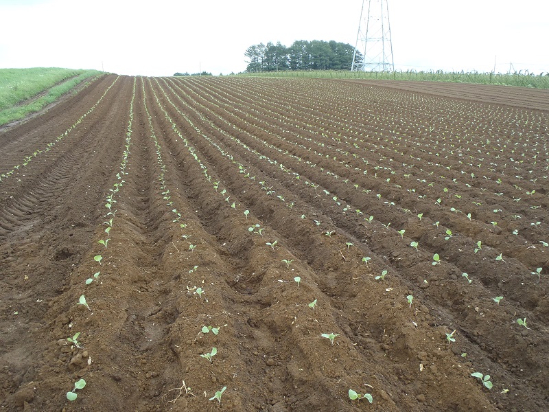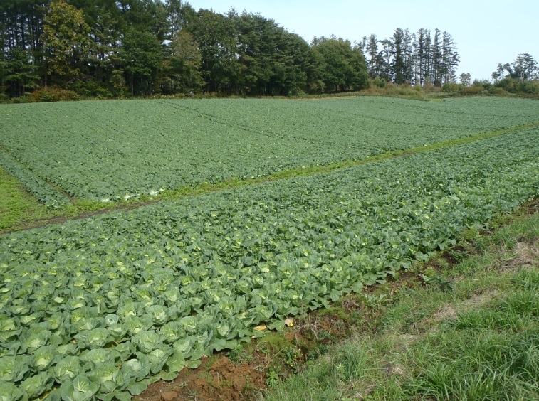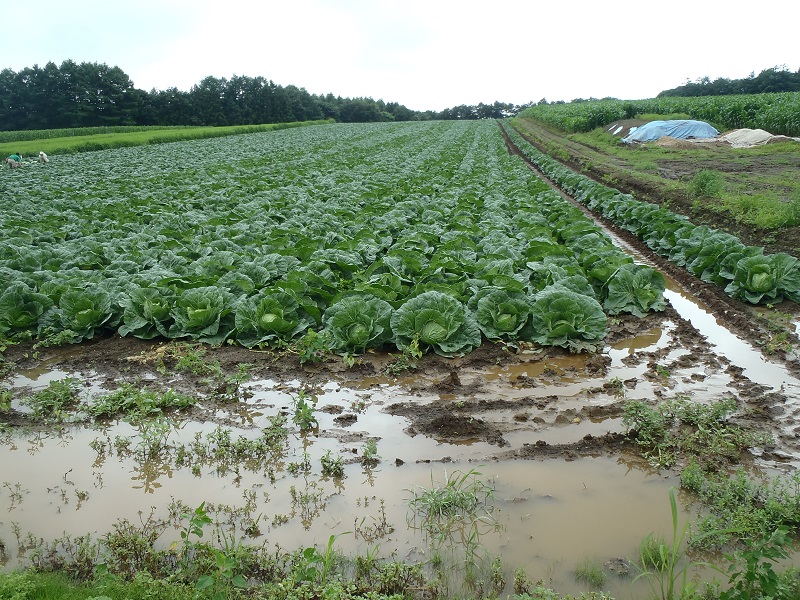 この圃場は定植から1カ月ほど経過しており、例年であれば畝の間の土が見えないほど外葉が広がっている時期のはずが、いずれも充分生育できていない。既に葉が巻き始める時期であり、今後も干ばつ状態が続くと、小玉のまま出荷時期を迎える可能性が高いため、販売金額の低下が懸念される。 | ||||||
