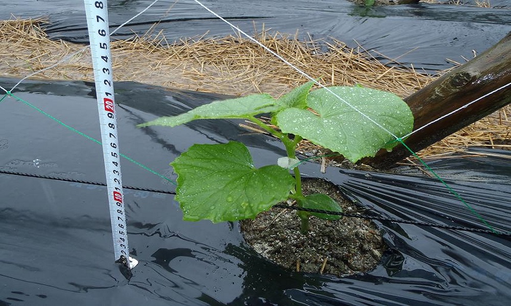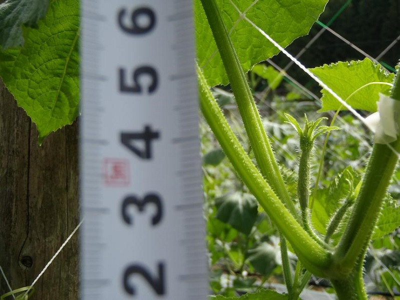 前回の定植時の調査の時は丈20センチ程度だったが、21日経過した今回は150センチ以上に成長している。しかしそのまま伸ばしていくのではなく、終了を多くするために親づるを150〜160センチ程度で止めて、子づる、孫づる、ひ孫づる…等と大きく育てていくそう。