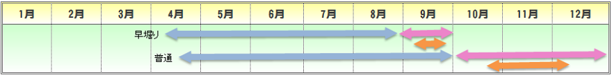| 播種期 | 定植期 | 収穫期 | 出荷最盛期 |