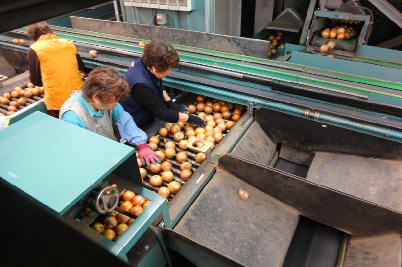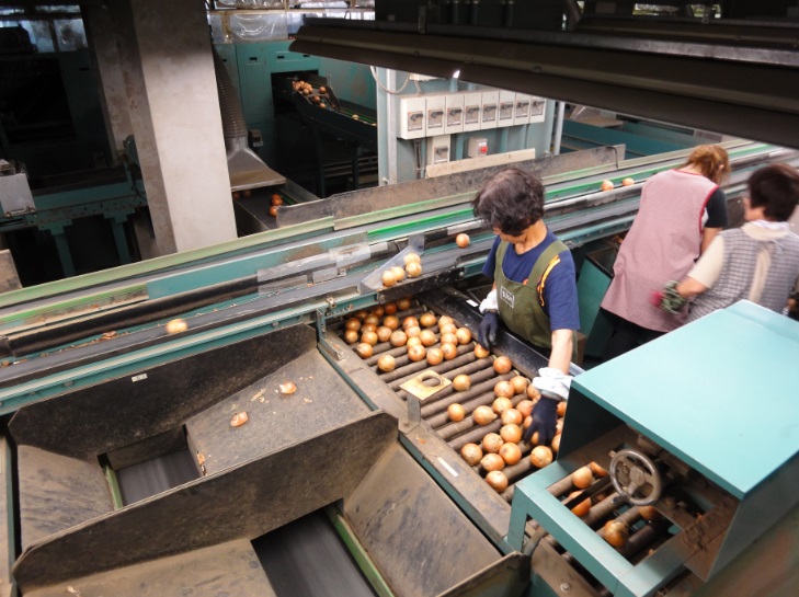 乾燥が仕上がると、粗選(腐敗品を取り除く)がある。 中段:選別工程の一部で、たまねぎの鬼皮を剥いているところ。 左側の箱のような部分にブラシがあり、ブラッシングしている。乾燥が悪いと鬼皮が剥けづらくなる。 下段:規格別に流れてきたものから、規格の異なるものや規格外品の除去作業を行っている。 | ||||||