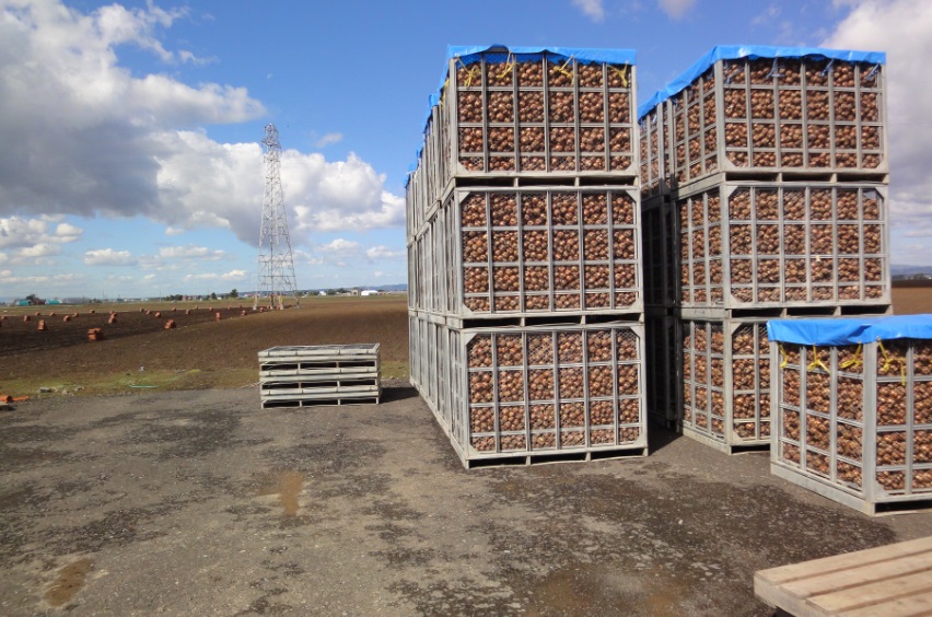 上段:圃場から収穫されてスチールコンテナに入れられ乾燥しているところ。翌年の4月まで保管し出荷するには、現物の乾燥状態が重要となる。