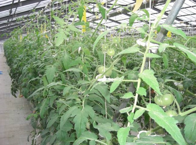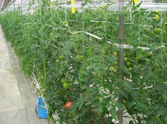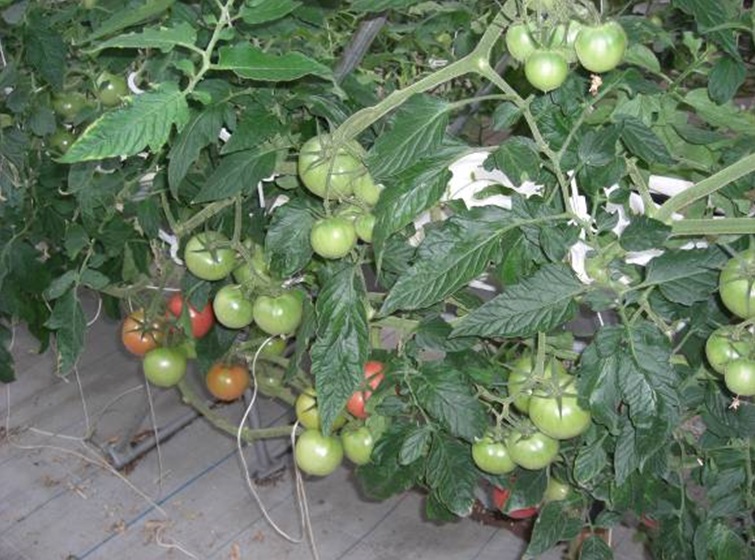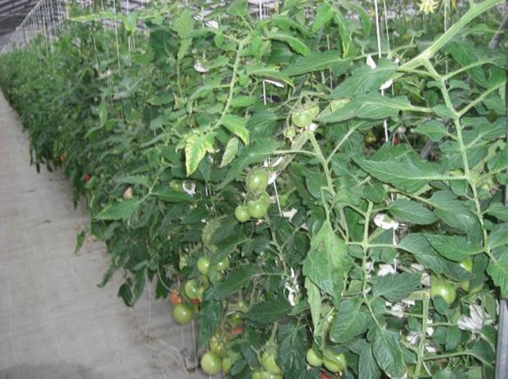 ・8月15日定植(購入苗:CFはるか、台木:スパイク) ・樹勢は回復し、生育は順調。病害虫の発生はほとんど無い。重油高であるが温度(10〜14℃設定)湿度等管理徹底に努めている。 ・現状14〜15段中心の収穫、格段3〜4個に適果、20段まで交配させている。 ・玉がついていれば7月までの長期採りで、収穫目標は25t/10aを目指したい。 | ||||||