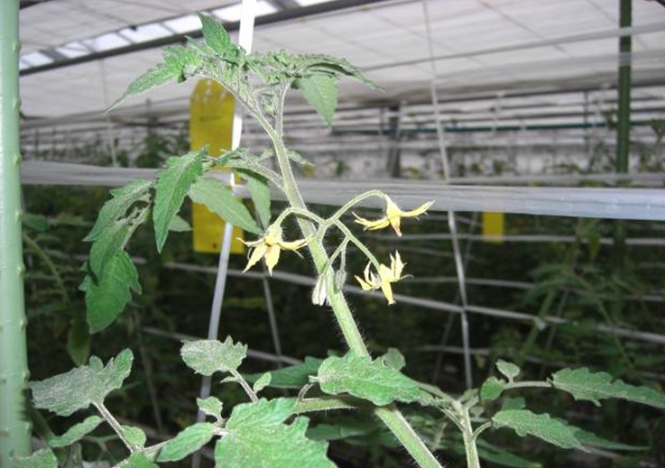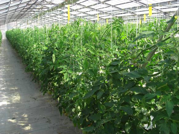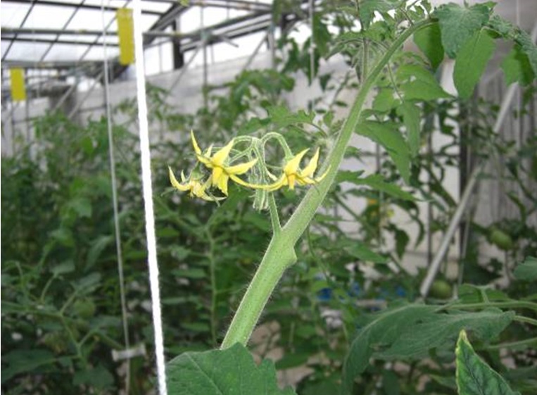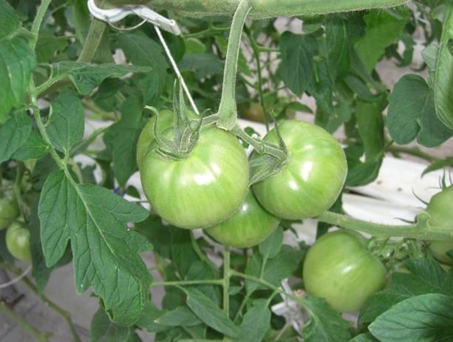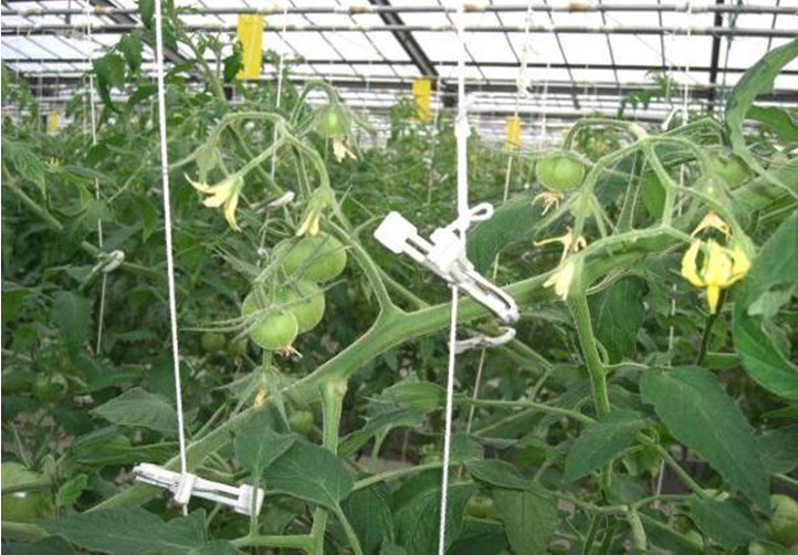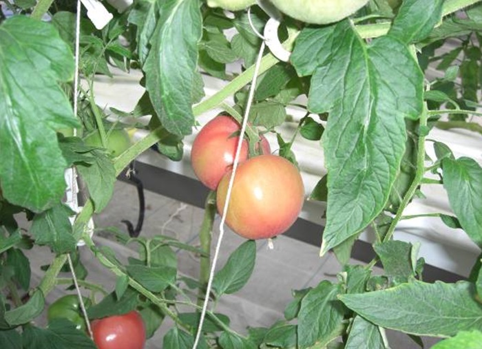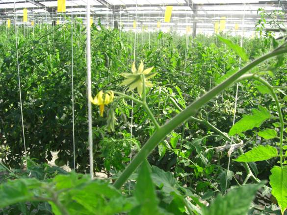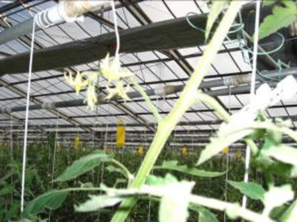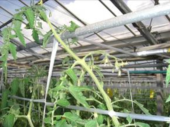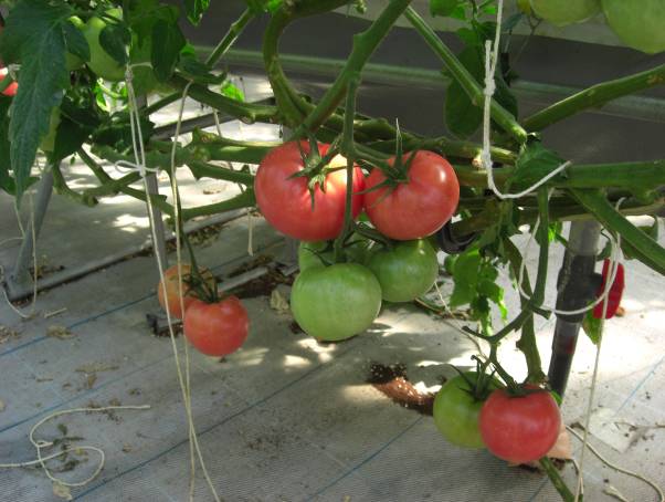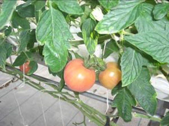 ・8月5日定植(購入苗:CFハウス桃太郎) ・生育は概ね順調であるが日照不足から樹勢が少し落ちている。 ・病害虫の発生はほとんど無い。温湿度管理徹底に努めている。 ・現在、11段を収穫中で交配は17段まで。 ・6月までの27〜29段の長期採り予定。 上段:日照不足から若干樹勢が弱い。 中段:11段収穫中 下段:17段まで交配 | ||||||
