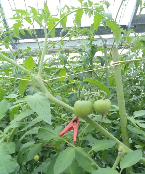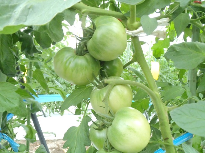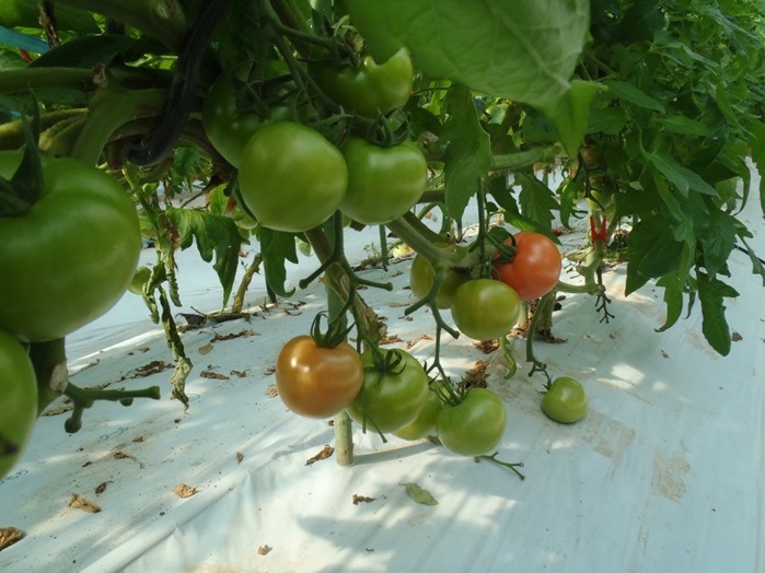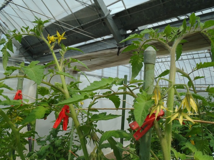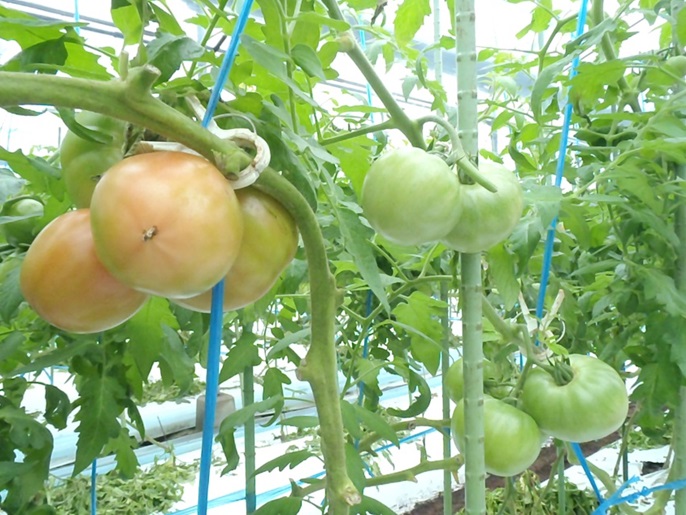 生育状況:概ね順調。病害虫は灰色かび病収まったが今後、気温・湿気が高ければ、再発が心配される。 出荷状況:10段前後収穫中。 着果状況:12〜14段、各段3〜4果。 上から 1枚目:15段前後開花状況。 2枚目:10段前後の収穫。 3枚目:14段着果、15段開花。 4枚目:11段〜13段着果。 | ||||||