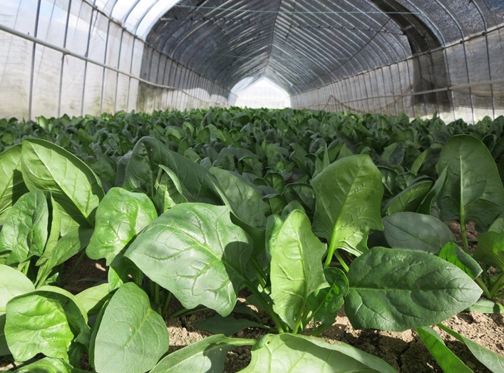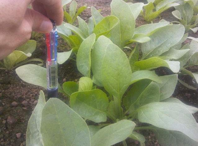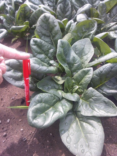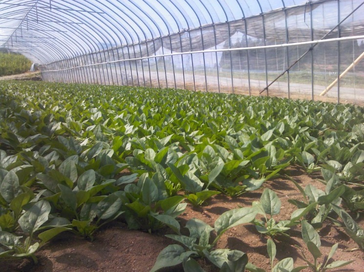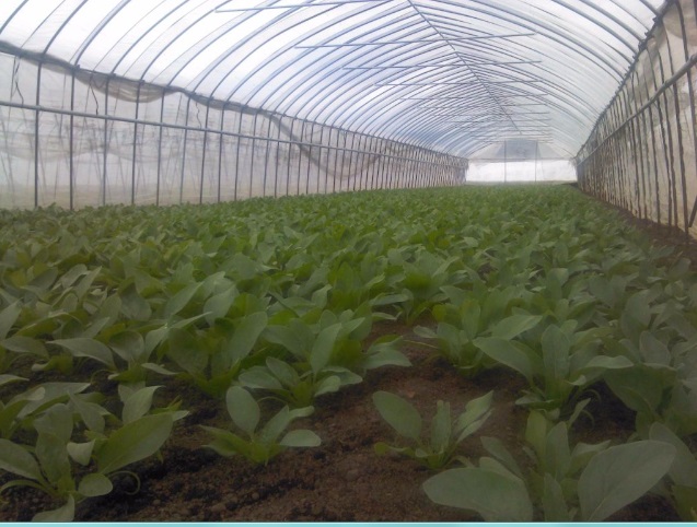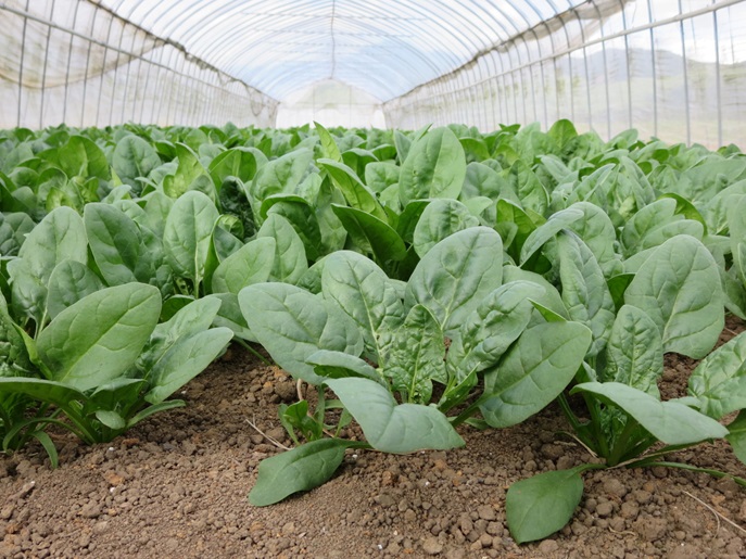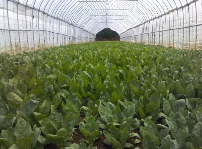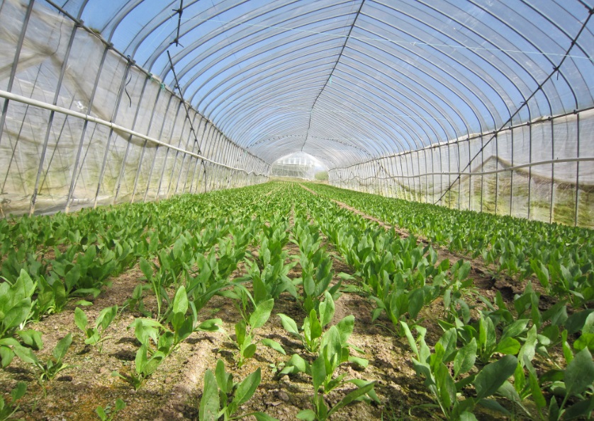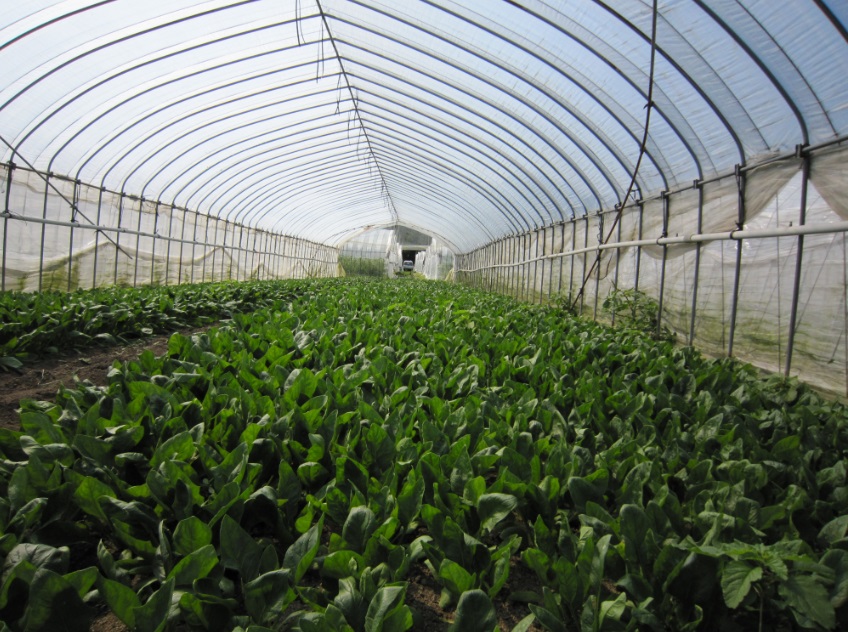 [写真の補足説明] JAひだ吉城 古川の圃場 (平成25年6月6日撮影) ・ 播種は1作目前年11月より日々行いその出荷は4月から始まるが、通期を通して年間4から5連作を行っている。最終10月中旬に播種を行ったものが12月に出荷となる。よって、同日に様々な生育状態のものがある。 | ||||||