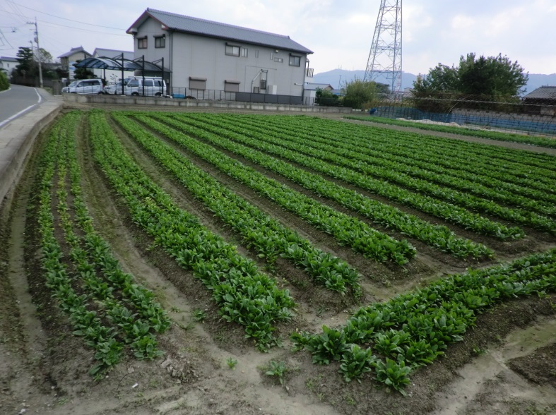・本圃場は面積が7畝で、品種は「新鮮力」と「クロノス」となっている。現在出荷しているものは10月播種分で、台風27号の被害を受けており葉に黄変等の傷みが見られる。
