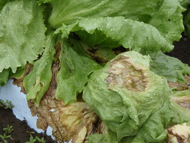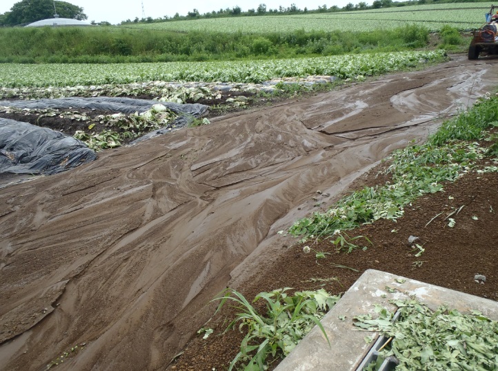 降雨・降雹は、25日午後に1時間ほど集中的におこり、道路の冠水、土壌の流出などの被害があったが、その地域は限定的な範囲だった。 写真は、雹害により傷んだレタスとその圃場。 | ||||||