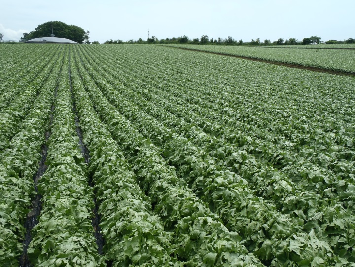 春先から低温が続いているため、定植された苗には保温のため覆いをかけている圃場が多く見られる。上の写真2枚は、昨日(5/14)久しぶりに気温が上がったため、覆いを外した圃場の状態。
