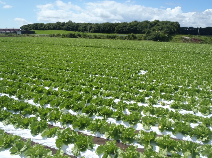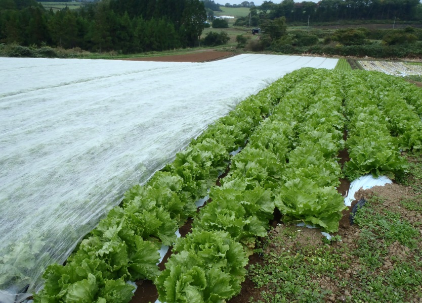 ・気温が日々低下してきており、10月上旬で出荷終了となる見込み。写真は低温のため生育状況が停滞していることから、保温用の資材をかけて保護している圃場。まもなく霜が降りる時期でもある。