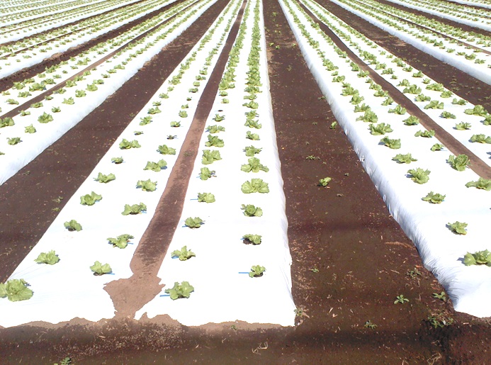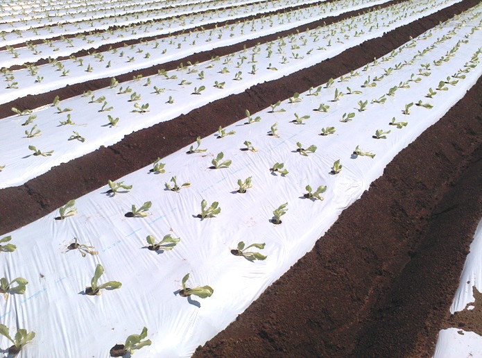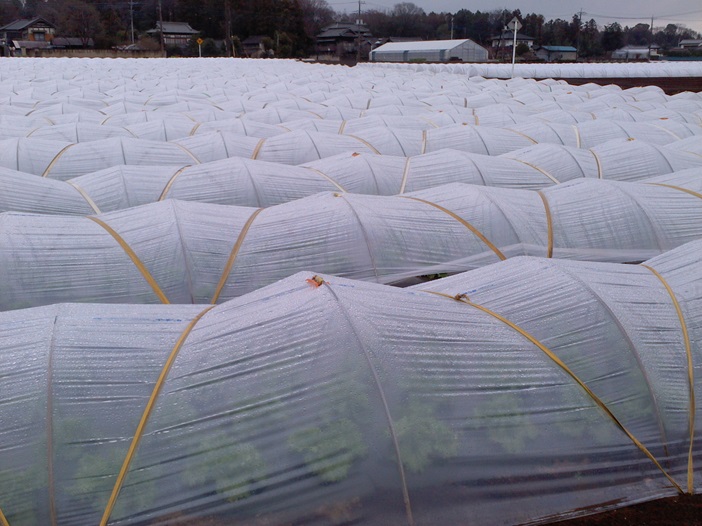 ・急な気温低下で、出荷間近の圃場は霜害防止のため不織布を使用している。