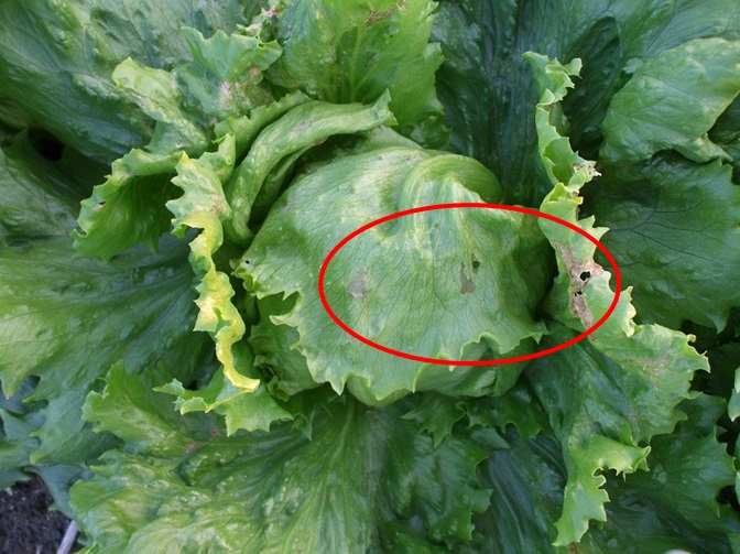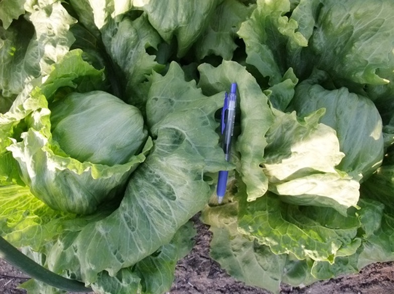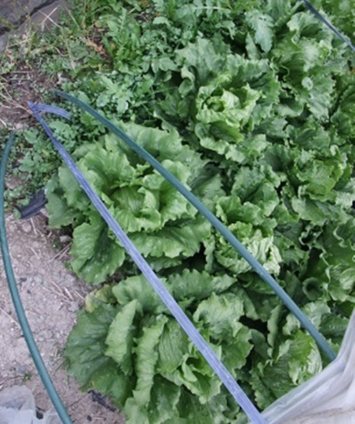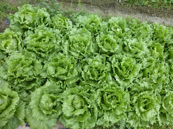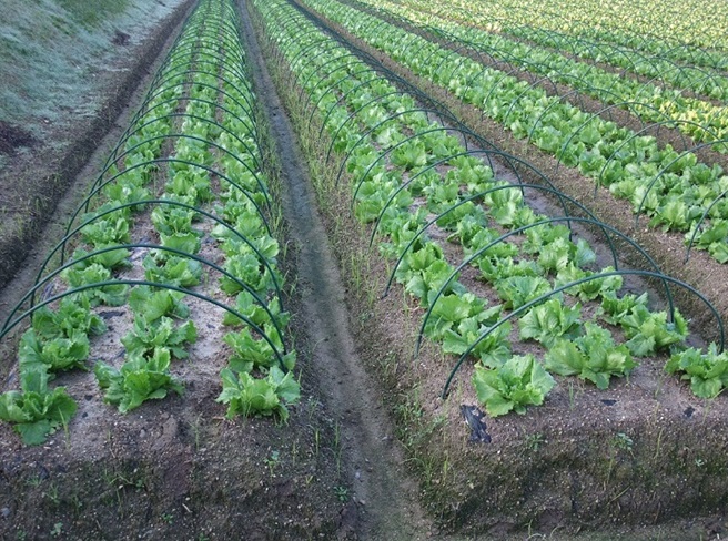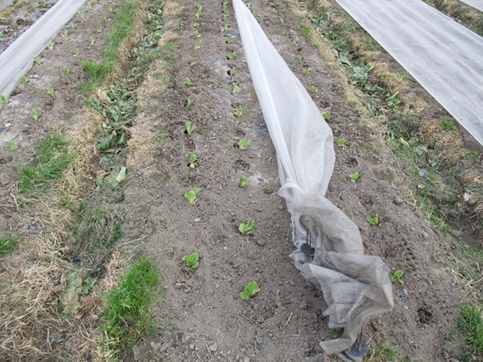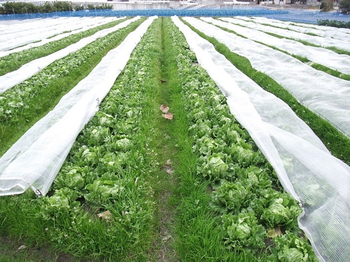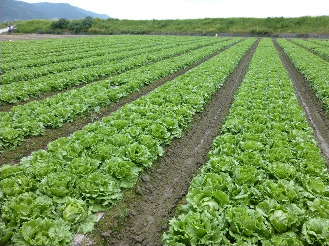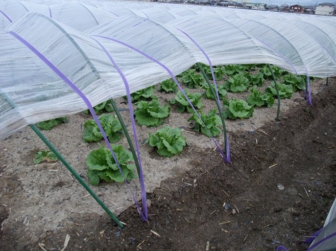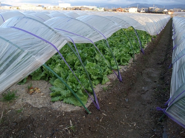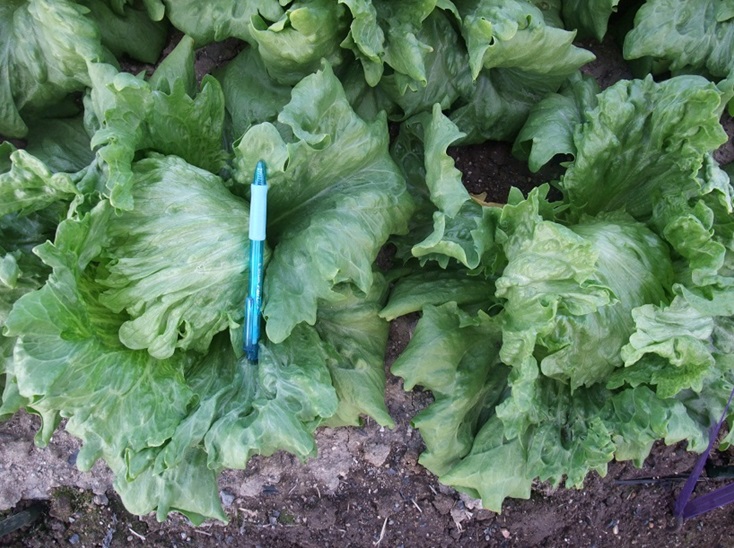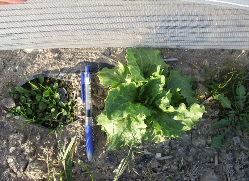 1枚目:10月15日前後定植で外葉形成期となっている。12月下旬収穫予定。11月下旬からのビニール被覆のための支柱を設置し始めている。 2枚目:9月25日前後の定植で、収穫期となったレタス。 3枚目:レタスを収穫後の圃場に2作目を定植したもの。2月上旬収穫となる予定。 4枚目:圃場により依然としてタバコガ・ヨトウムシによる食害も多い。 | ||||||