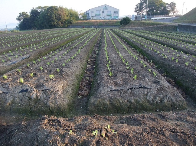 1枚目:ベタ掛け被覆による収穫直前の圃場。例年に比べL・M階級が中心で小玉傾向。また生育のばらつきもあり一斉収穫とはならない。 2枚目:1枚目の圃場の収穫後に苗を定植したところ。 このあとトンネル被覆をおこなう。 3枚目:10月29日頃定植2月上旬出荷予定。生育順調。 4枚目:排水の悪い圃場では定期的な降雨による滞水があり生育のバラつきや遅れがある。10月16日定植。例年であれば年末から年明けにかけ出荷できるが約1週間程の遅れ。 | ||||||
