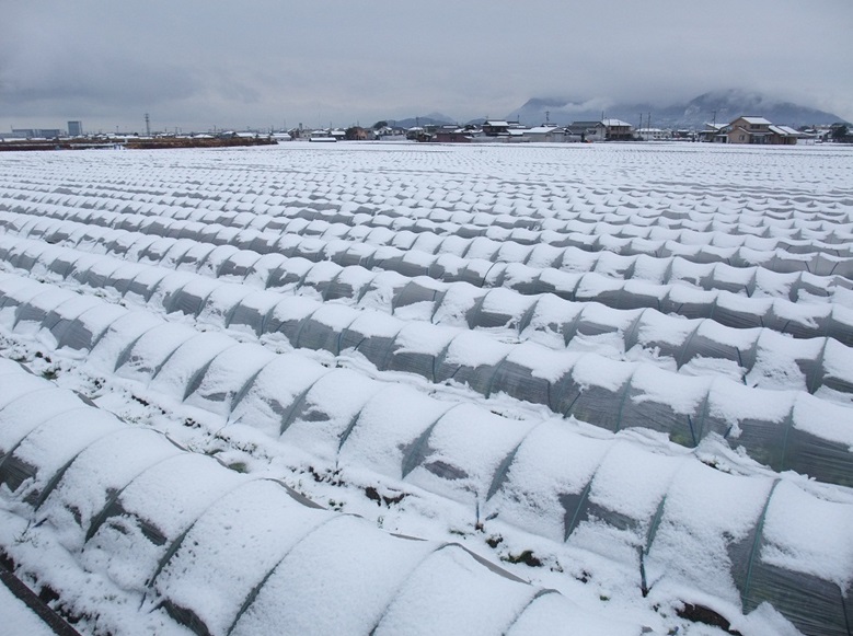 上から 1枚目:収穫中の圃場(11月上旬定植)、予定より約10日間の遅れ。 2枚目:12月20定植。3月20日頃収穫予定のもの。生育は順調。 3枚目:収穫レタスの中に低温によるトンネル内の締め込みと、降雨に よる多湿で、例年なら乾燥し病気の少ない時期であるが、圃場により散見される。すそ寒気がされている圃場は少ない。 4枚目:2月8日の積雪状況、2月14日も同様であった。当産地での積雪はまれである。 | ||||||