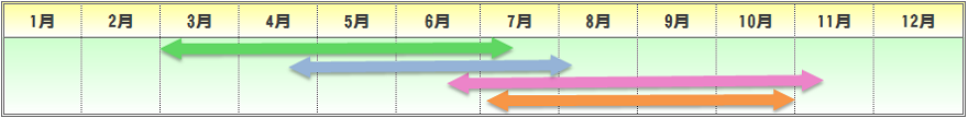 | 播種期 | 定植期 | 収穫期 | 出荷最盛期 |