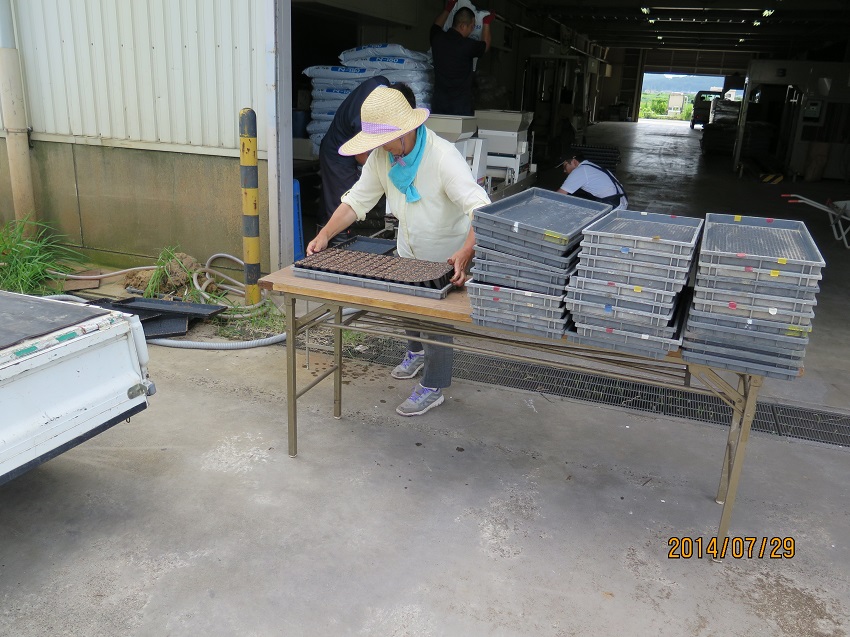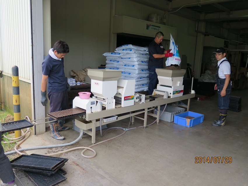 播種をJAの水稲育苗施設で行った後、各自がトレイを持ち帰り25〜30日間育苗後、JAの定植機で定植予定。
