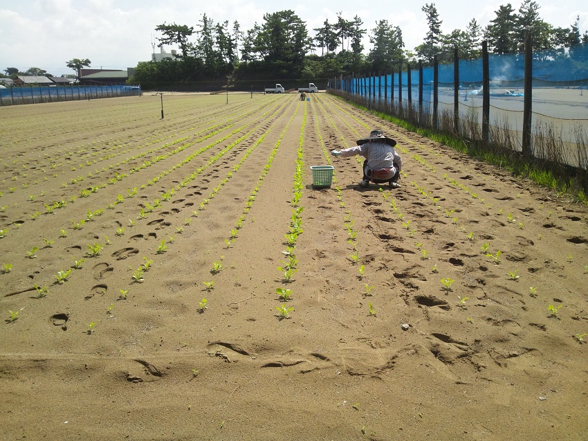 ・上段:芽が出そろってきた圃場(8月下旬播種の圃場) ・下段:雑草を手作業で取り除いている | ||||||