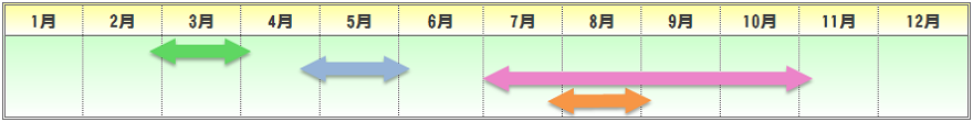 | 播種期 | 生育期 | 定植期 | 収穫期 | 出荷最盛期 |
