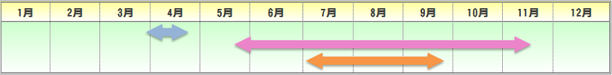 | 播種期 | 生育期 | 定植期 | 収穫期 | 出荷最盛期 |