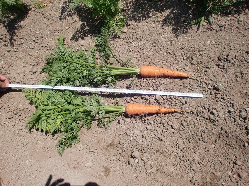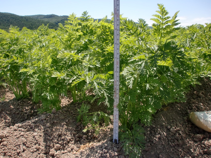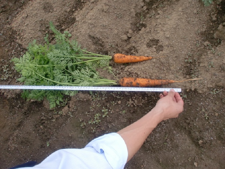 ・上段:4月19日に播種(この地区で一番早く播種)した圃場で生育順調である。生育の初期はバラツキ(むら)が見られたが現在は回復している。 ・中段:抽苔は見られないが、若干徒長気味か。草丈35cmくらい。 ・下段:生育の良いものを抜いてみました。草丈40cm 根長17cm。真空播種機を使用した圃場で、向陽2号とは違います。 | ||||||
