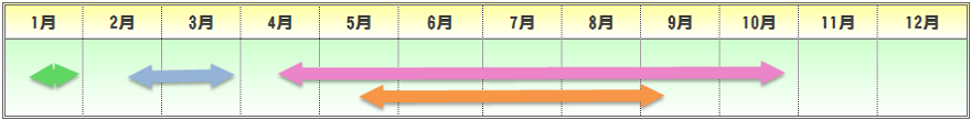 | 播種期 | 生育期 | 定植期 | 収穫期 | 出荷最盛期 |