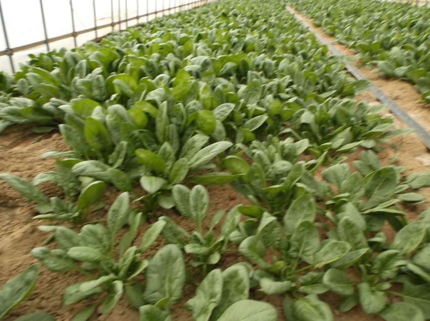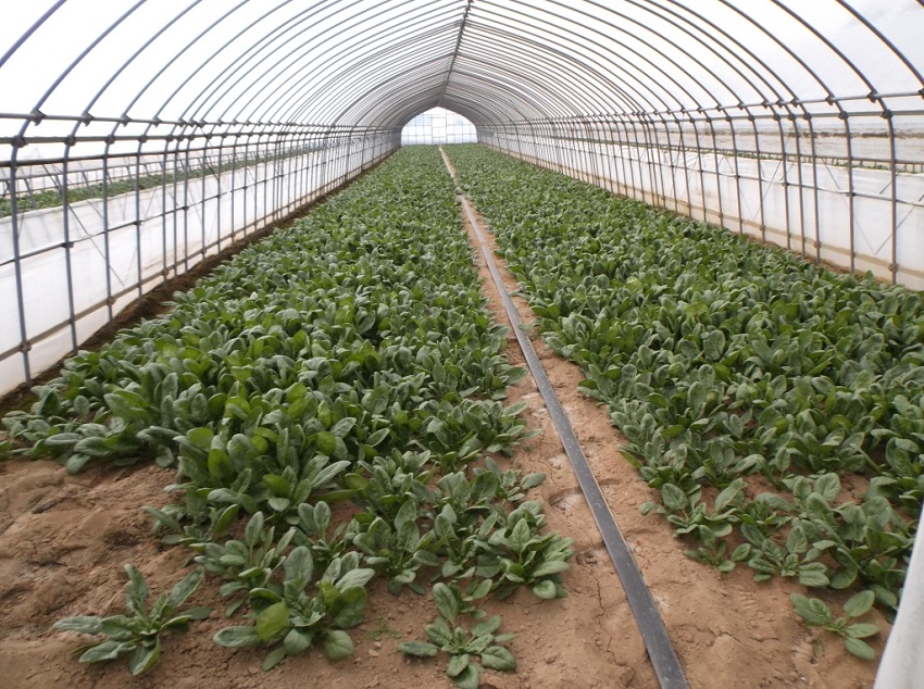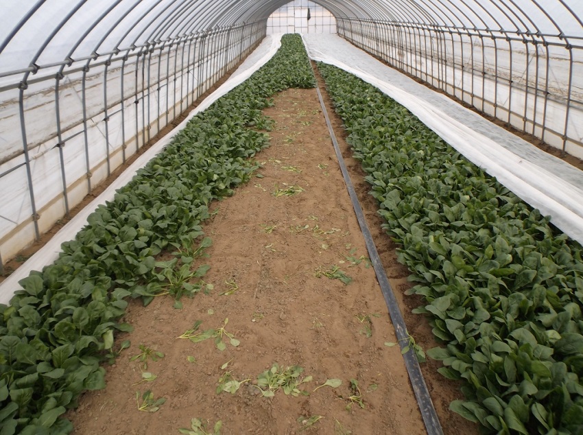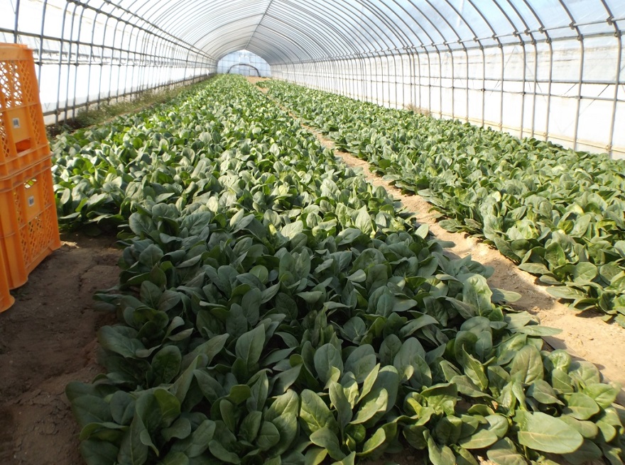 ・20棟の内10棟が9月上旬に播種し、現在収穫期に入っている。 ・残りの10棟は収穫を終え、次の播種のために起耕してあった。こちらは11月上旬に播種を予定しているとのこと。 ・現在のところ、害虫の被害や病気は発生しておらず、順調に生育・出荷出来ている。 ・出荷量の見通しとしては、ハウスは多くが2月の大雪のため損壊し生産量は減る見通しだが、その分、露地が増え、全体としては昨年をやや下回る見込みとなっている。 ・上段:収穫中のほうれんそう ・下段:ハウス内全景 | ||||||