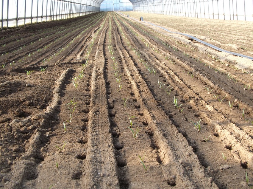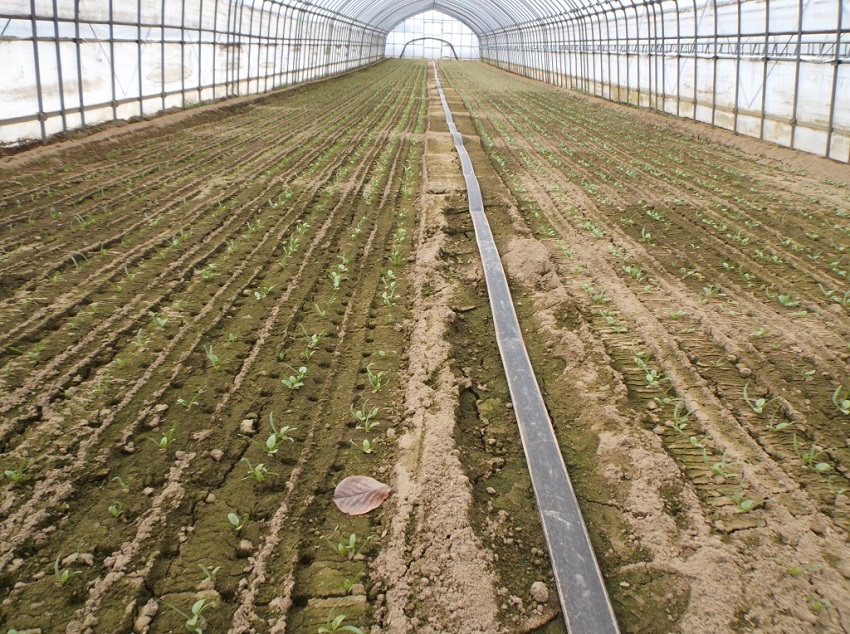 ・早めに収穫を終えたハウスでは既に、次のサイクルに入り、早いものは本葉が出ていた11月に播種したものは出荷までに70〜80日かかっているが、今回播種したものは、気候が暖かくなることから60日前後で収穫できるとのこと。 ・病害虫については、温暖になってきたことから、ホコリダニの被害が現れているとのことである。 ・このハウス群は気象条件にもよるが、4月から5月はじめの収穫に向けて作業に入っている。 ・写真は、播種後約3週間、本葉が出てきている。収穫は4月の上旬頃からとなる。 | ||||||