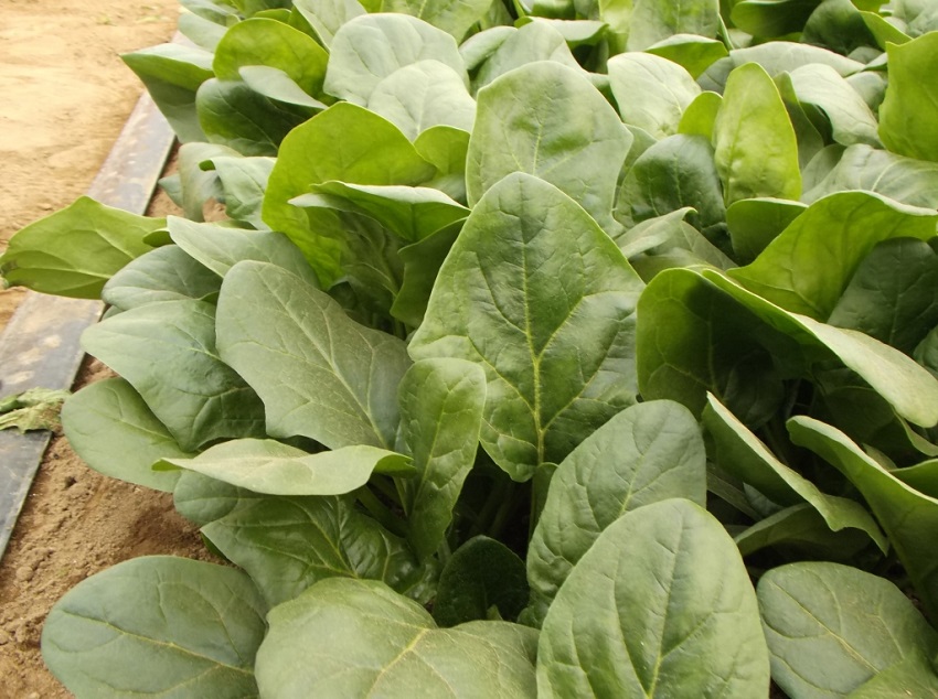ただ、同じハウスでも向かって右側の隅に近い方は寒さで相当遅れており、不織布を被せて温度を上げて生育を促しているが、収穫できない状態である。 ・同じことが時期出荷予定のハウスでも発現しており右側の隅の一体が大幅に遅れているのが一目瞭然である。不織布等で覆うなどいろいろと工夫しているが生育遅れと出荷量の減少は否めない。 ・病害虫については、ホコリダニの被害が散見されており、防除に注意しているとのことです。 ・今後このハウスは気象条件にもよるが、1月下旬から2月始めまで収穫される予定である。 ・上段:収穫中のほうれんそう ・下段:葉の拡大写真 | ||||||