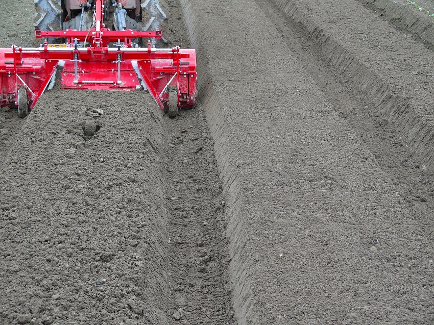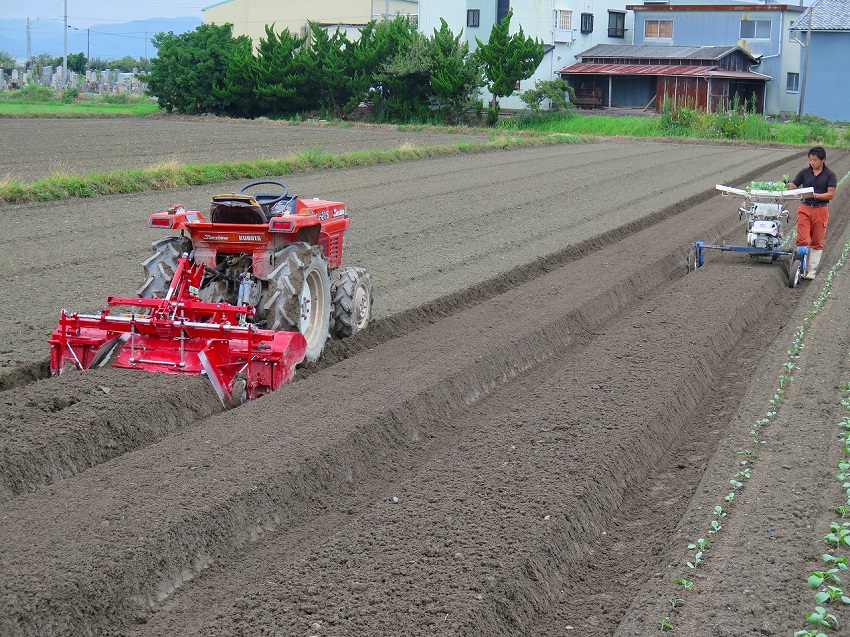・1枚目:苗の老化を回避するため、定植を一刻も早く行うべく、雨の止み間に畦立・定植を行っている。