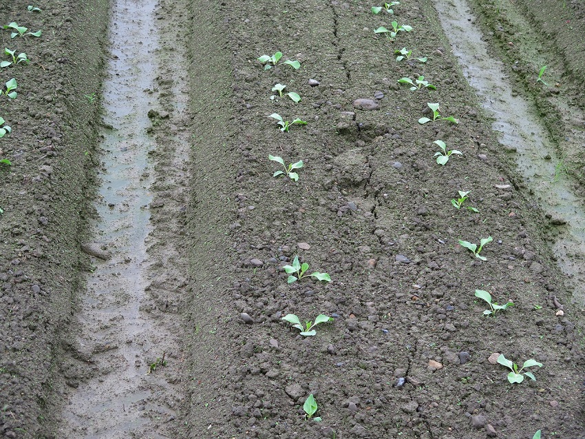 ・2枚目:子葉が落葉し本葉が徒長し老化現象が現れ始めた苗。 ・3枚目:圃場が乾いた状況(右側)で成型した畦。左側(トラクター側)は土壌水分過多で畦立を行ったため、土が団子状で壁土状態となりキャベツの生育に悪影響を及ぼすと考えられる畦。 ・4枚目:初期生育が順調な8月16日定植のキャベツ。 ・5枚目:天候不良の影響を受けている8月28日植えのキャベツ。 | ||||||