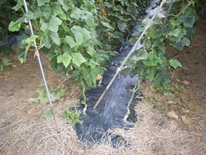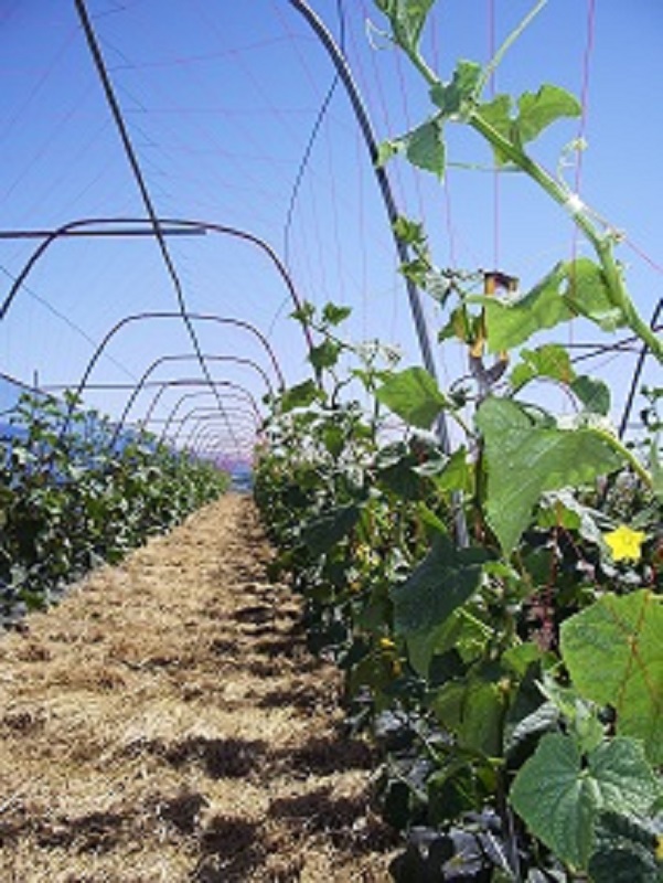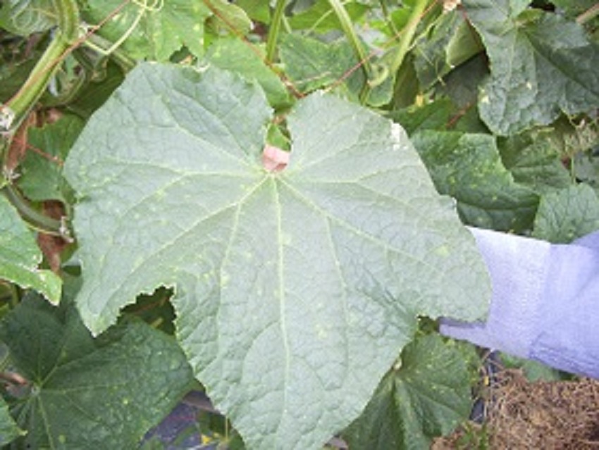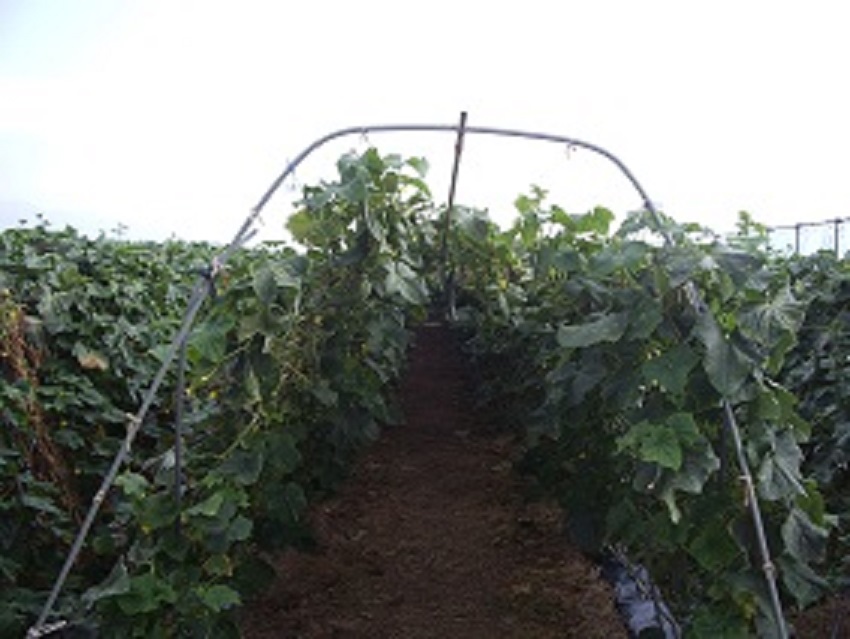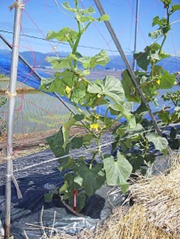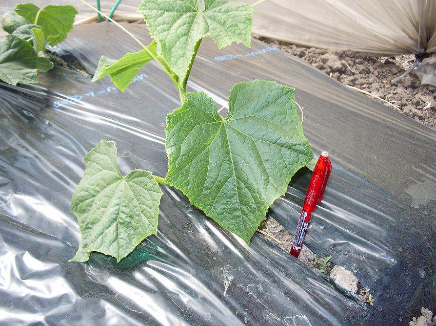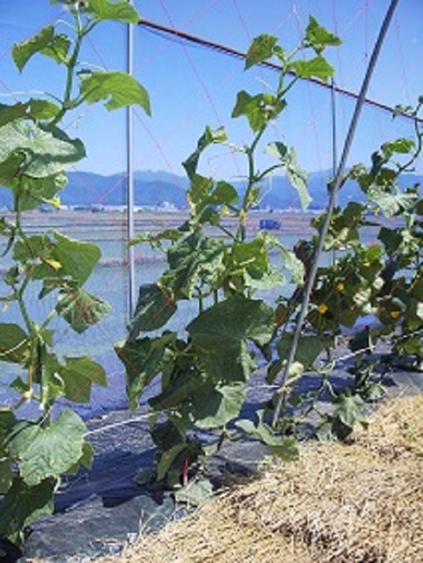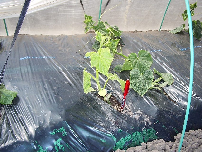・雨による水分補給がないため、実の内部に水分不足による若干の空洞が見られるが、つる伸びや実の生育は順調。 ただ、春型の寒さに強い品種を植えた他の圃場では、乾燥により葉等しおれているところがある。