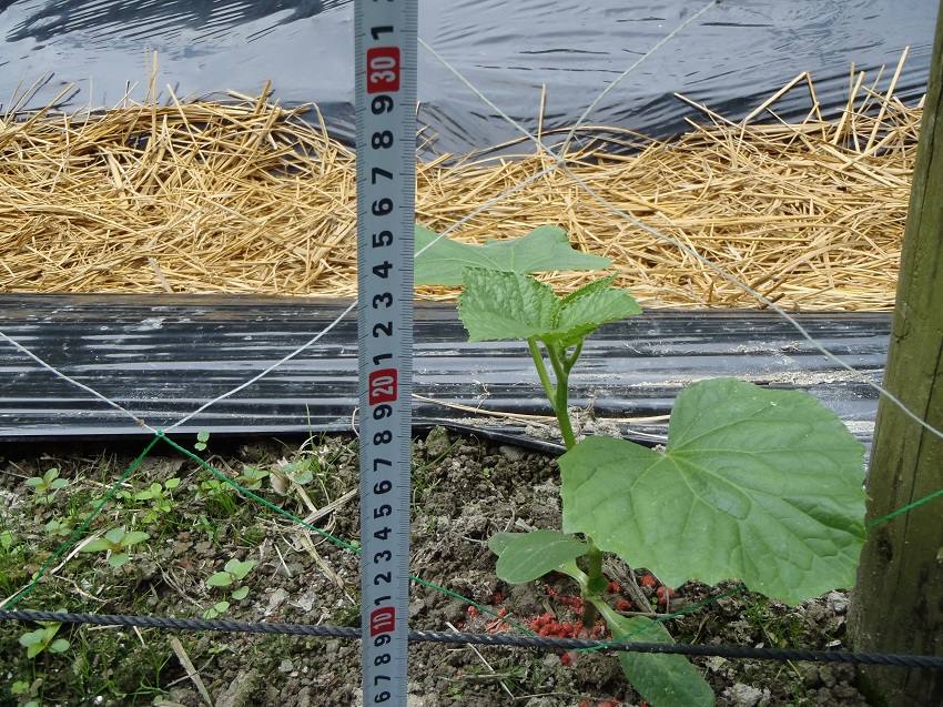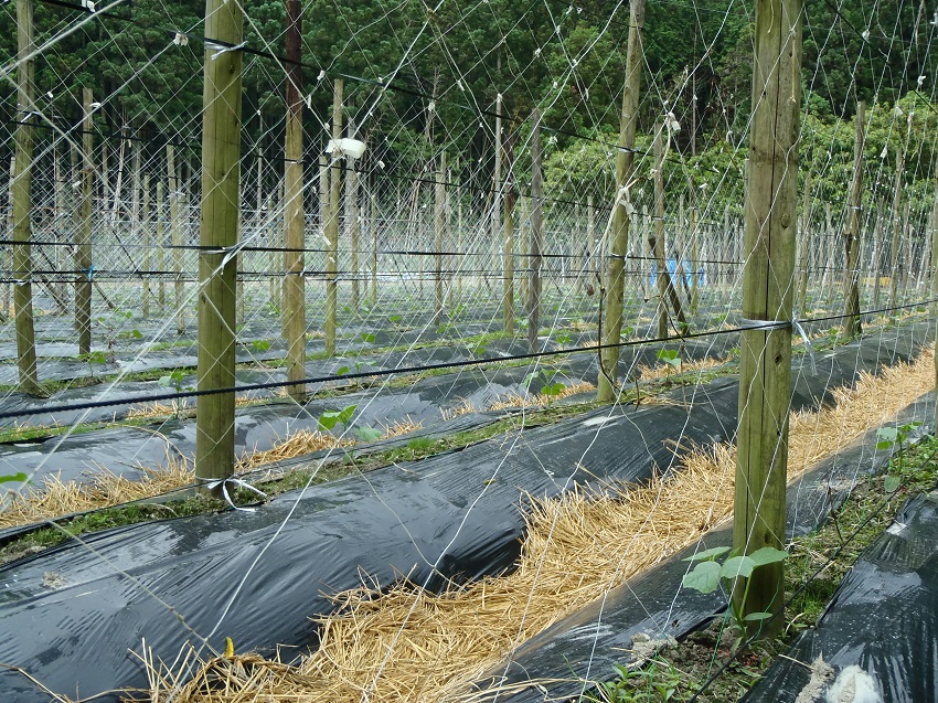 ・6月19日に定植し、その後4日経過しており活着した模様。 ・根元に撒いている赤い粒剤は、根切り虫退治のもの。 ・20〜25cm程度に成長し、台木の双葉を取り除く時期となっており、その後は誘引作業が行われる。 ・この産地では、使用ネットは18cmマスに統一し、1枚のネットの長さも統一しコストの削減を図っている。 ・山間地の谷あいということもあり、朝晩の冷え込み対策(地温を上げる)として黒マルチが敷かれている。また敷くことにより除草対策にもなっている。畝の間に藁を敷いているが、これも少なからず除草対策となり、また、足元のぬかるみ防止となり作業の効率化や泥はね防止となっている。 ・圃場は山間地の谷あいにあり、夏の冷涼な気候を利用した夏秋採りを行っている。 | ||||||
