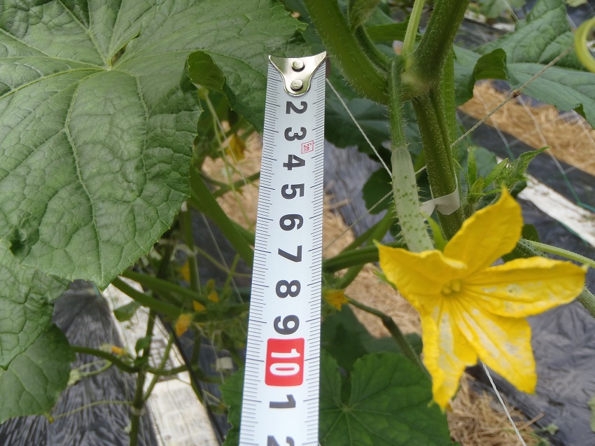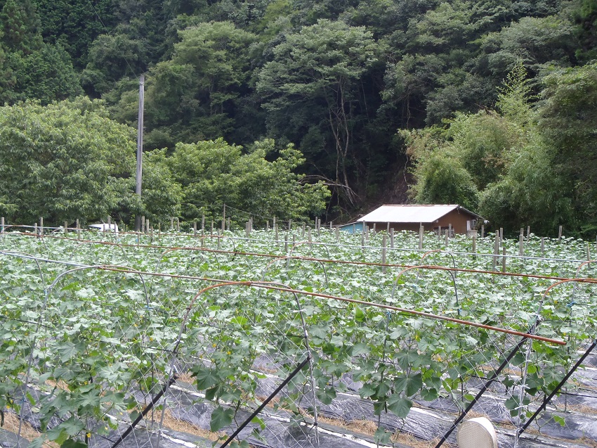 ・6月19日に定植し、5週間後の状態。 ・天候不順により生育が遅れ気味。 ・7月22日から出荷が始まった。 ・圃場により異なるが、ベト病・疫病・褐斑病・黒星病が発生。今年は、病気の発生頻度が高い。 ・ウリノメイガの発生も見られる。 ・圃場は、山間地の谷あいにあり、夏の冷涼な気候を利用した夏秋採りを行っている。 | ||||||