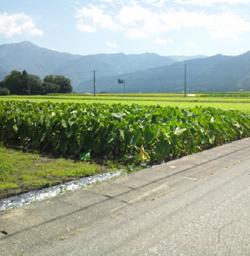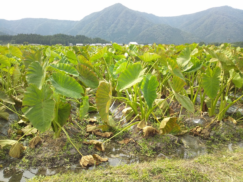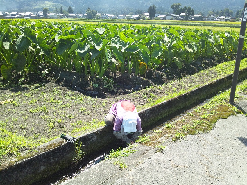 芋茎の高さは、概ね130cm程である。 ・中段:秀品率を上げるため、小芋茎を取り除いている圃場。 こちらの圃場の芋茎の高さは、およそ140cm程度。 ・下段:作業が終わり、使用した鎌を洗っている。 猛暑が続いているので、作業は午前中で終えている。 | ||||||
