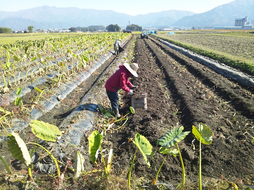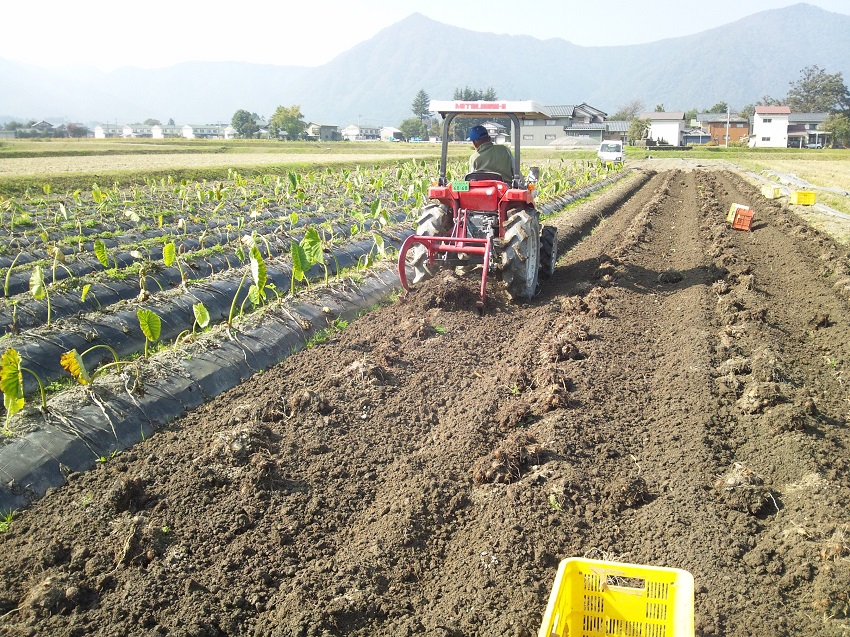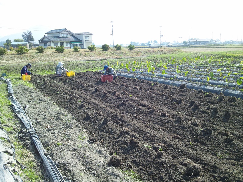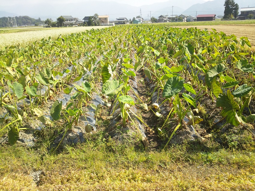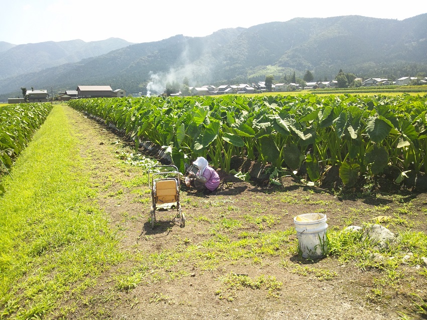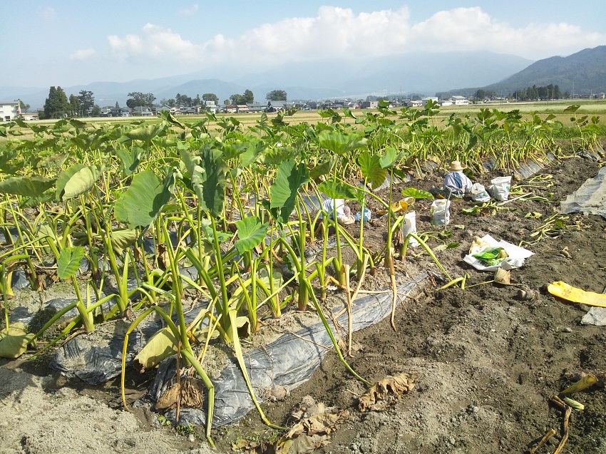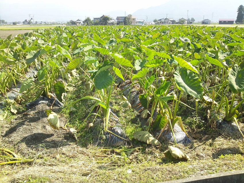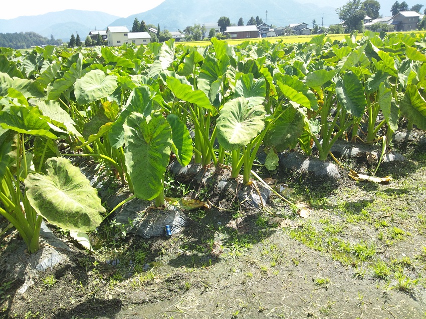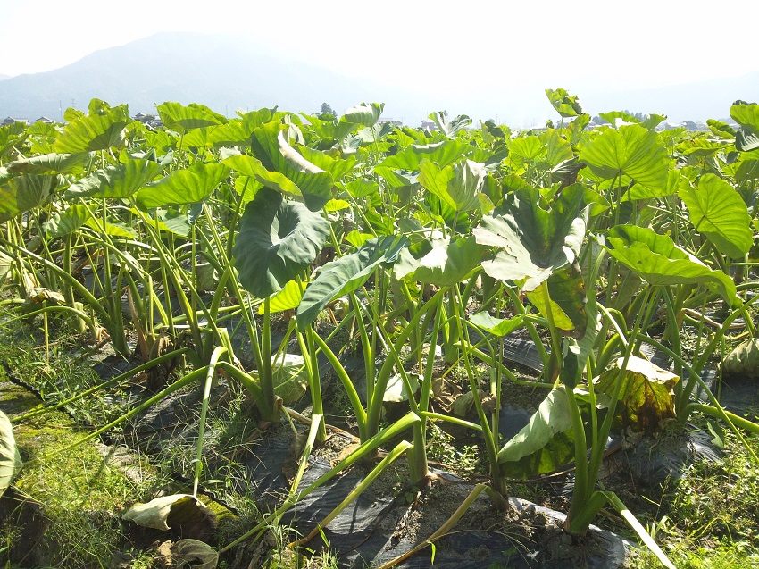 ・秀品率を上げるため、小芋茎を取り除いている圃場もある。