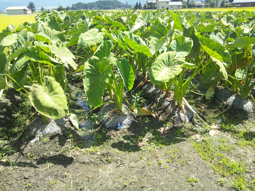 残っている芋茎の高さは、およそ140cm程度。 ・中段:こちらの圃場の芋茎は、かなり減ってきた。 残っている芋茎の高さは、130cm程度。 ・下段:芋茎の枯れてきた圃場。 通水を実施している。 | ||||||