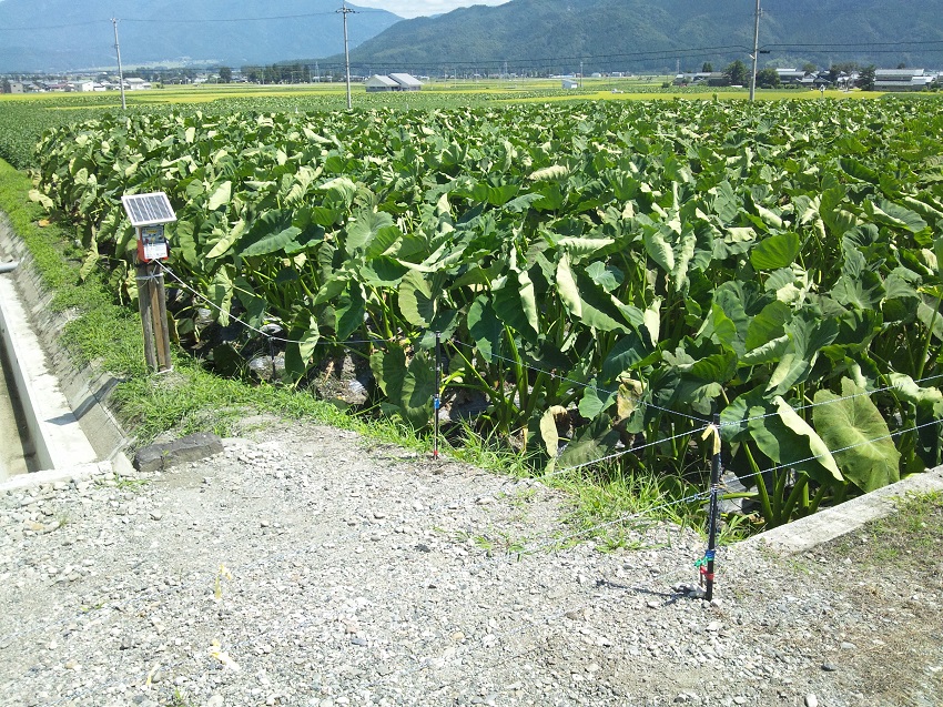 芋茎の高さは、概ね140cm程である。(この圃場は生育が若干遅い) ・中段:芋茎が折れてきた圃場。 こちらの圃場の芋茎の高さは、およそ145cm程度。 ・下段:山辺の圃場では、イノシシ進入防止の電気柵が設けられている。 芋茎の高さは、150〜160cm程度。 | ||||||