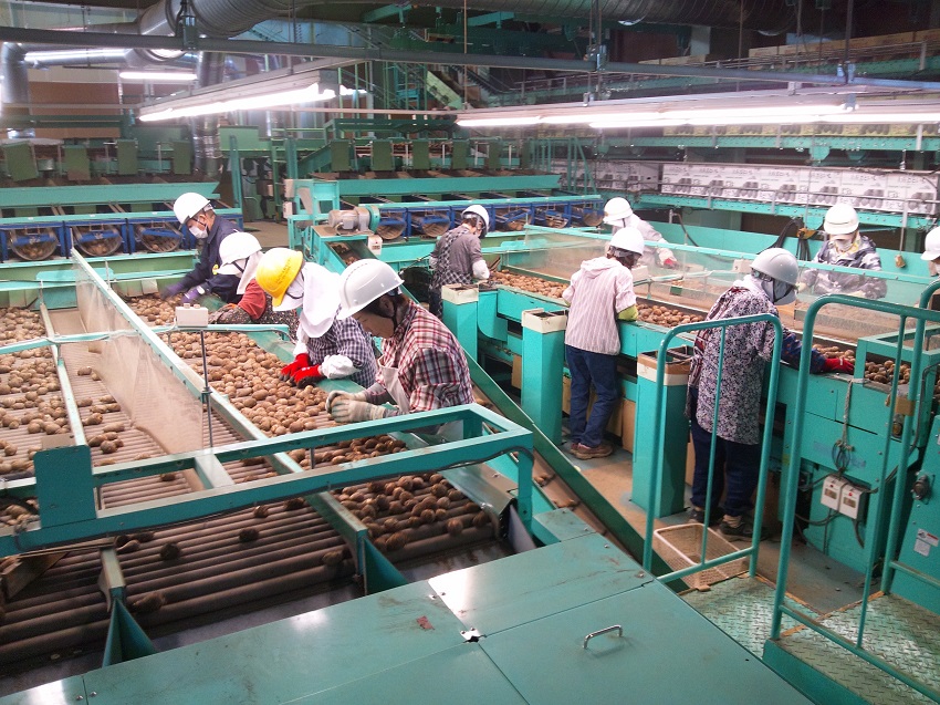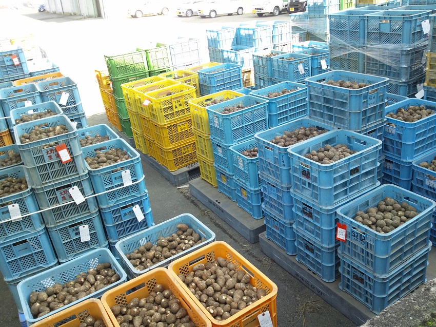 圃場の奥ではマルチ(防草)シートを取り除いている。 圃場手前では掘った芋をコンテナ籠に詰めている。 ・中段:集荷施設に運び込まれたコンテナ籠。(前回よりは、Lサイズも若干増えてきた。) ・下段:選果場での選別作業。(傷がないかの確認。) | ||||||