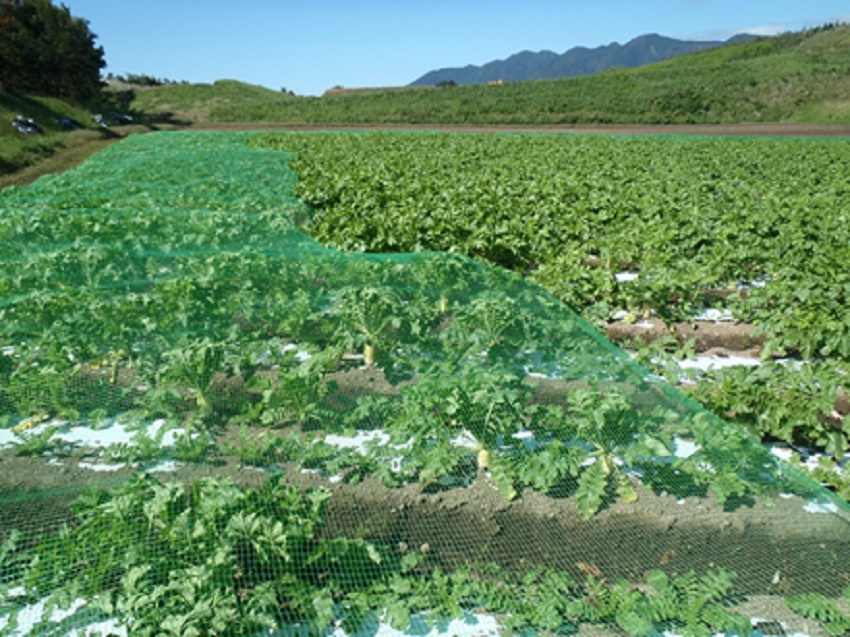 ・場所:JA阿蘇 小国郷管内 ・生育状況:現状、生育良好。ただし、朝夕の冷え込みで5〜7日の遅れはある。 病害虫は特に発生はない。 ・上段、中上段:8月中旬播種、10月中旬〜下旬より収穫予定の圃場。 ・中下段、下段は8月25日台風接近による被害。 ・中下段:暴風ネット被覆。 ・下段:雨風による吹き散らし。 | ||||||