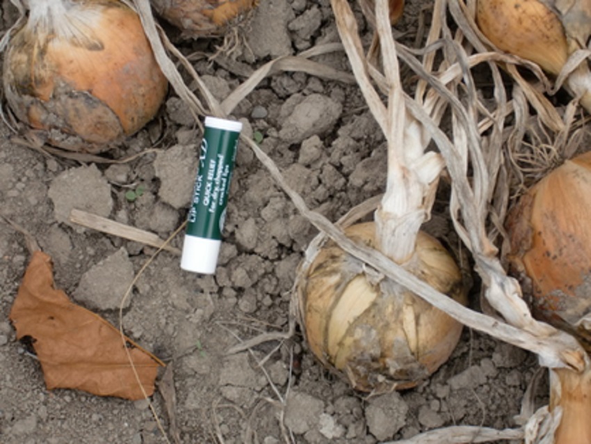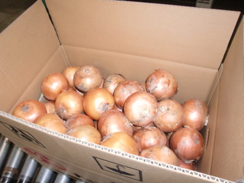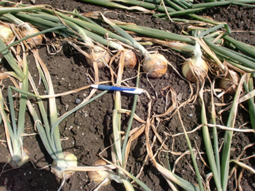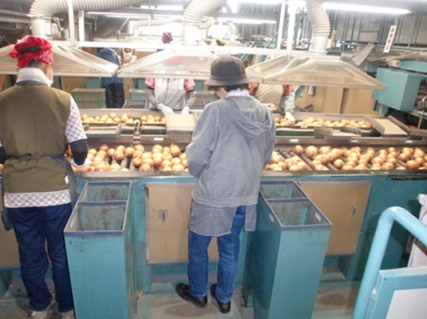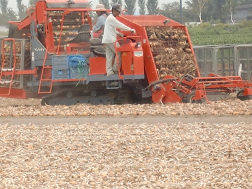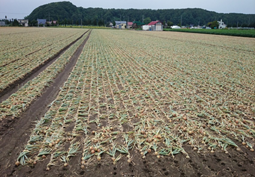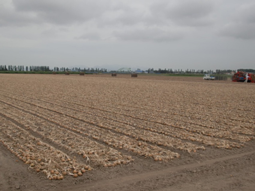 ・上段:JAの玉ねぎ施設外の玉ねぎ置き場。