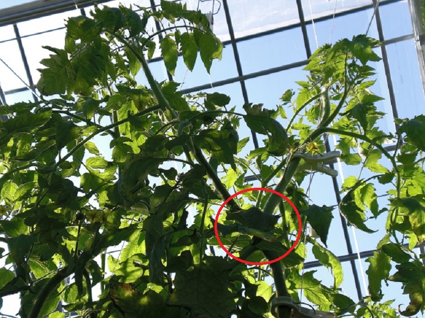 ・品種:麗旬 ・上段:前回の上段の写真の苗。 ・中上段:順調に育っていて出荷寸前のトマト。 ・中下段:生長するにつれて、○印の吊り下げをして、収穫する果実の高さを一定にしている。 ・下段:側枝候補の枝。 | ||||||