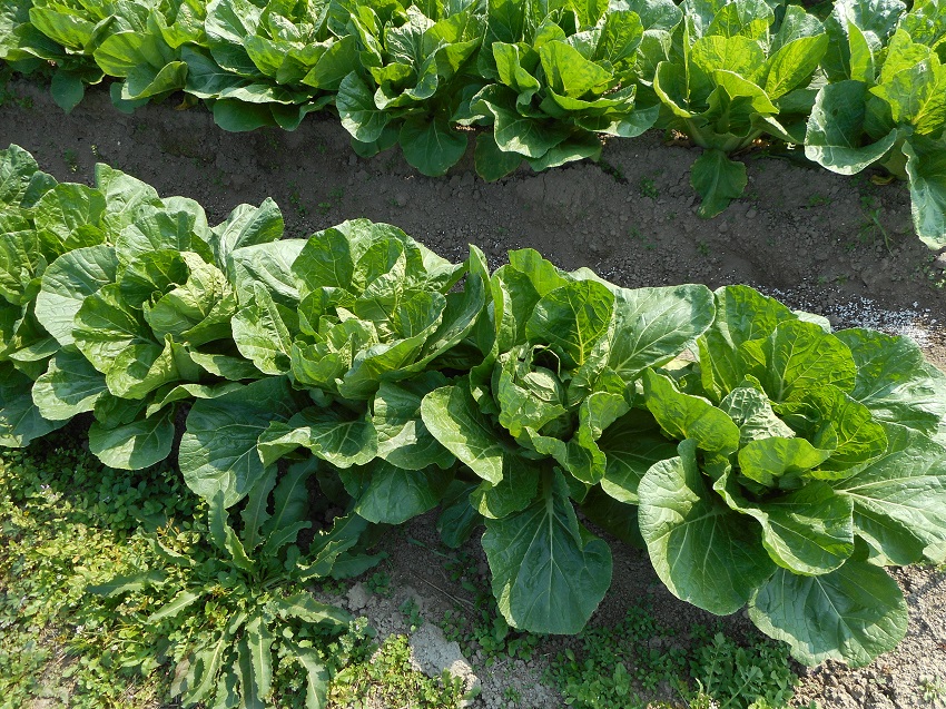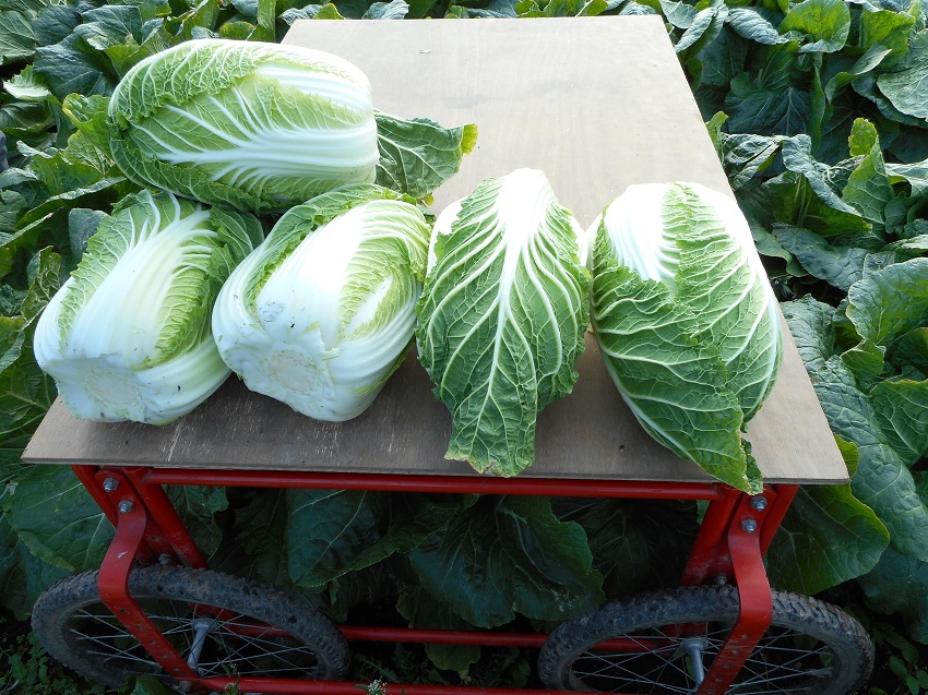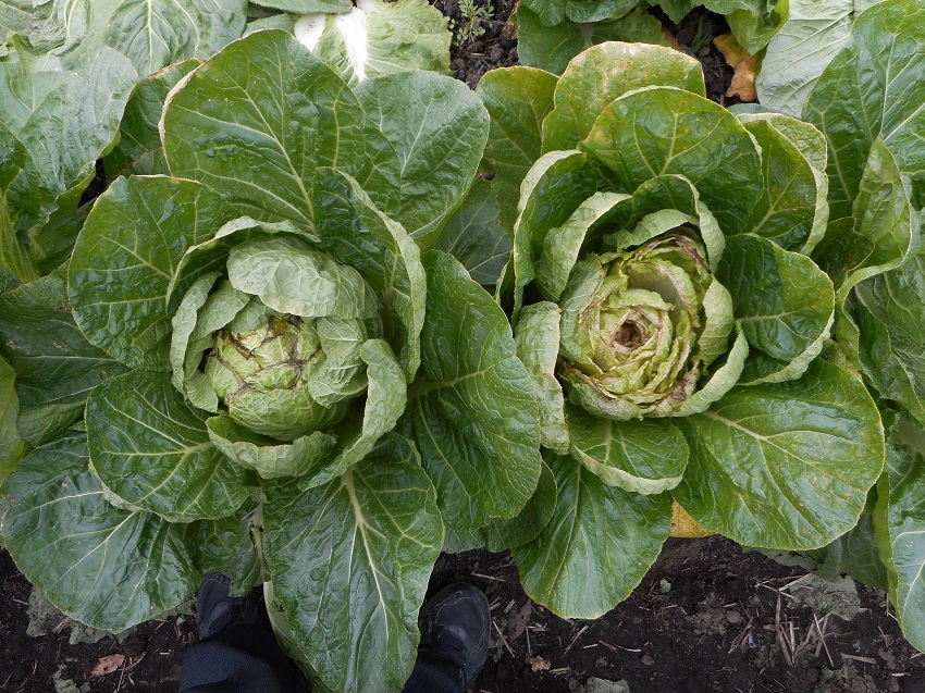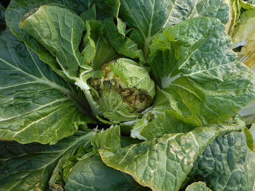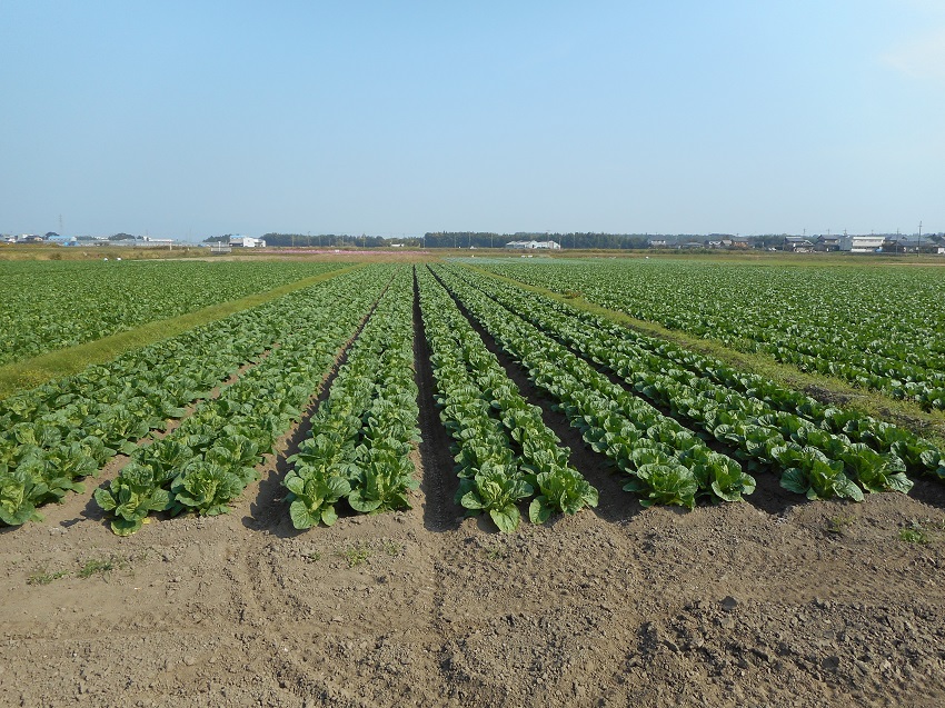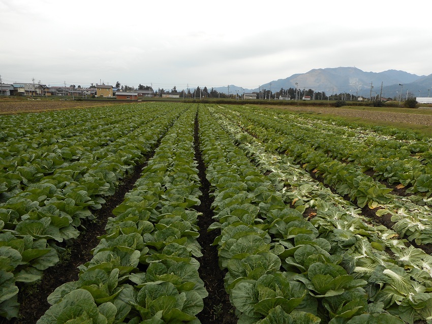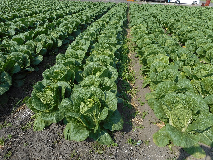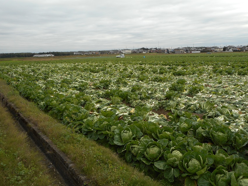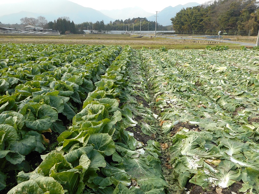 ・上2枚:11/25収穫中の圃場。 ・中下段:11月下旬収穫期を迎えたもの。10月干ばつの影響で葉が巻かず、葉先が変色している。出荷出来ない。 ・下段:出荷出来ないものが残っている。一玉ずつ慎重に確認しながら作業するため時間が掛かる。 | ||||||