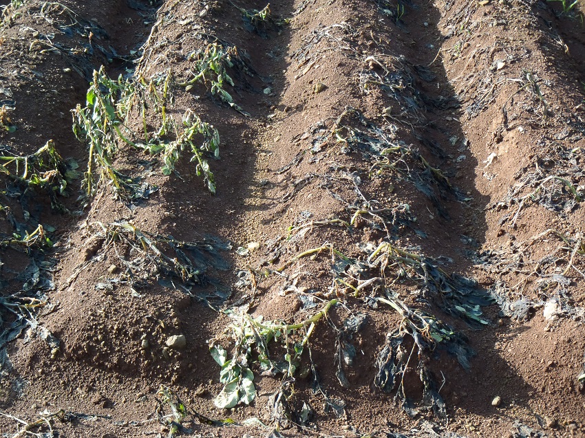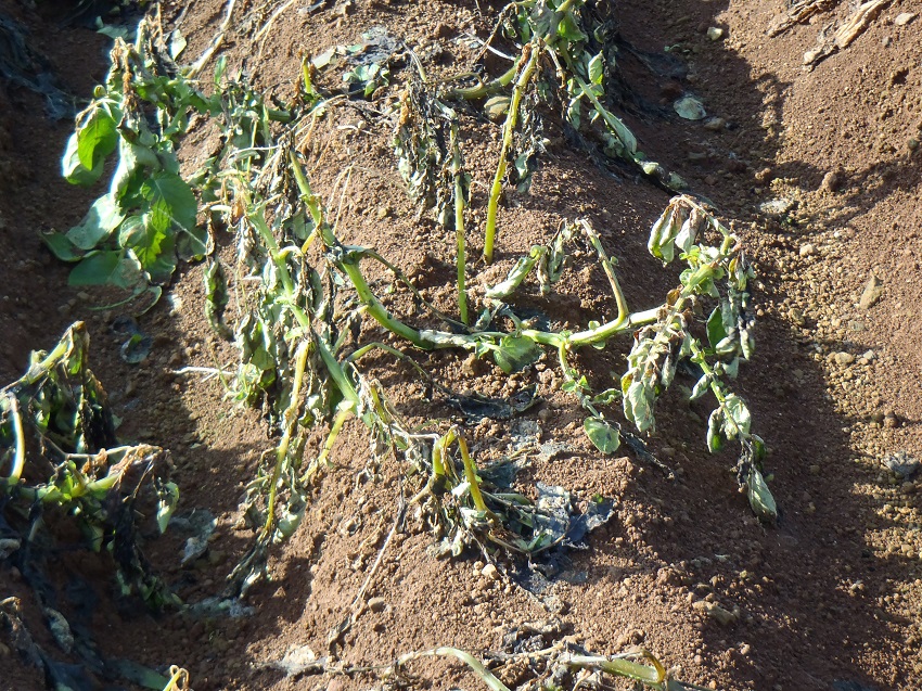 ・上段:12月17日の降霜により葉が枯れた圃場。