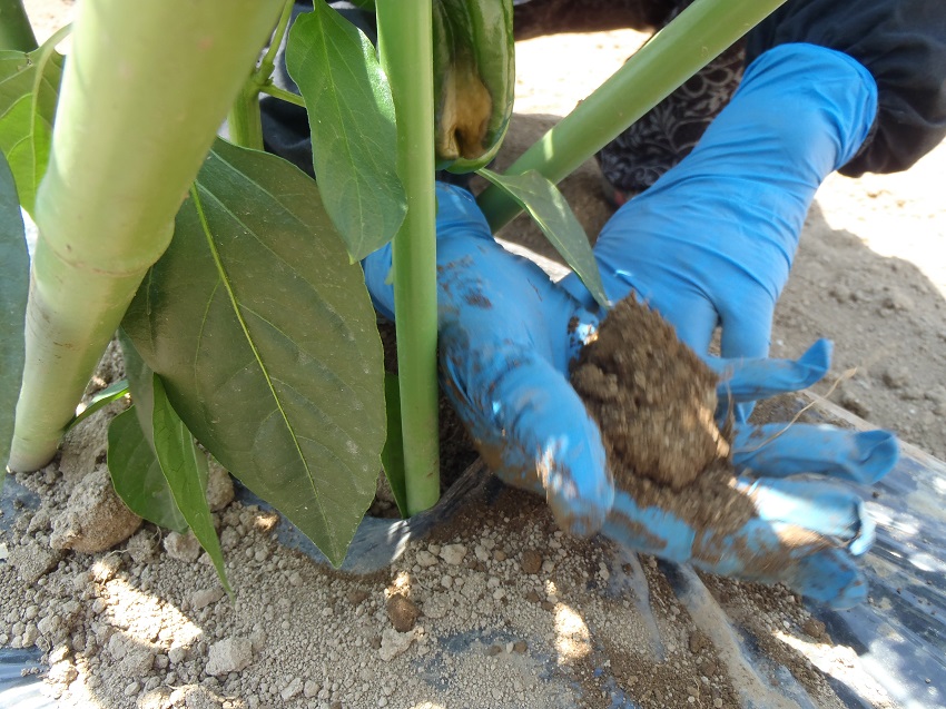・雨が降らないため、防除等に使用する薬剤や肥料を液状のものに切り替える等、生産者はJA等の指導の下、干ばつ対策に努めている。 ・マルチ内の土も乾き気味。 | ||||||