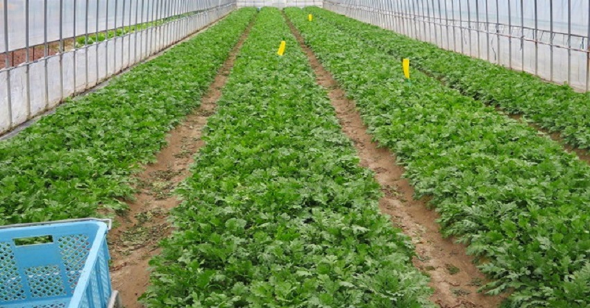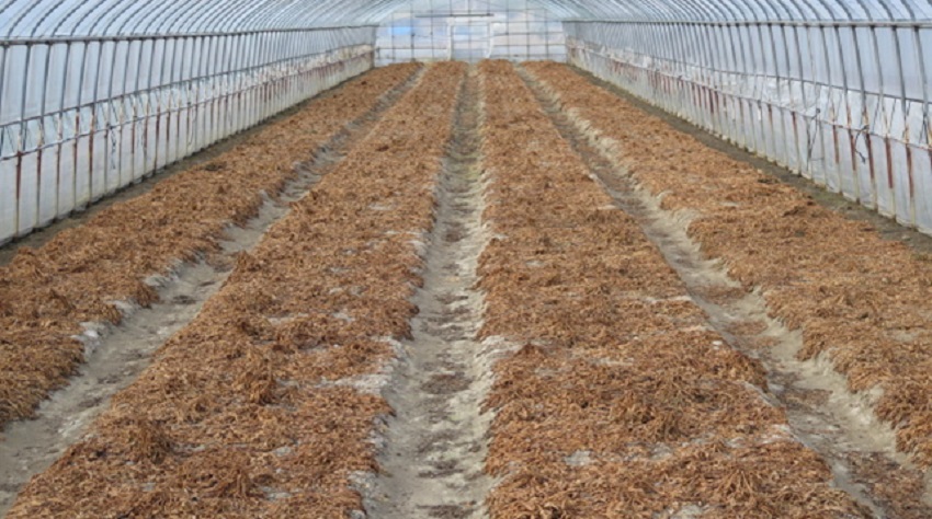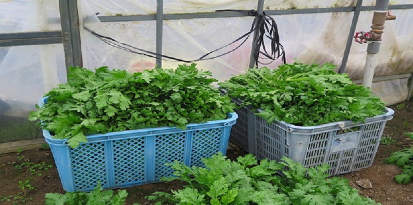 ・中上段:収穫末期のため、葉やけが多発している。 ・中下段:次作準備のため、例年より半月早く収穫を切り上げている。 ・下段:例年なら、しゅんぎくの収穫中であるが、今年はすでに次作の準備が進んでいる。 | ||||||