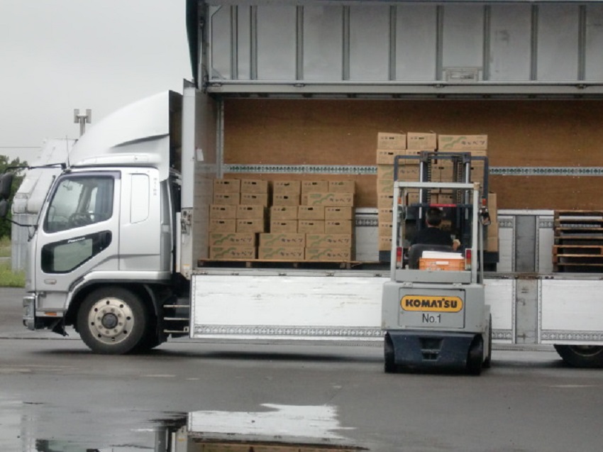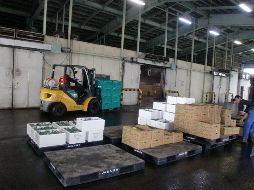 ・上段:集荷場に生産者が持ち込んでいる様子、フォークリフトの奥が予冷庫。