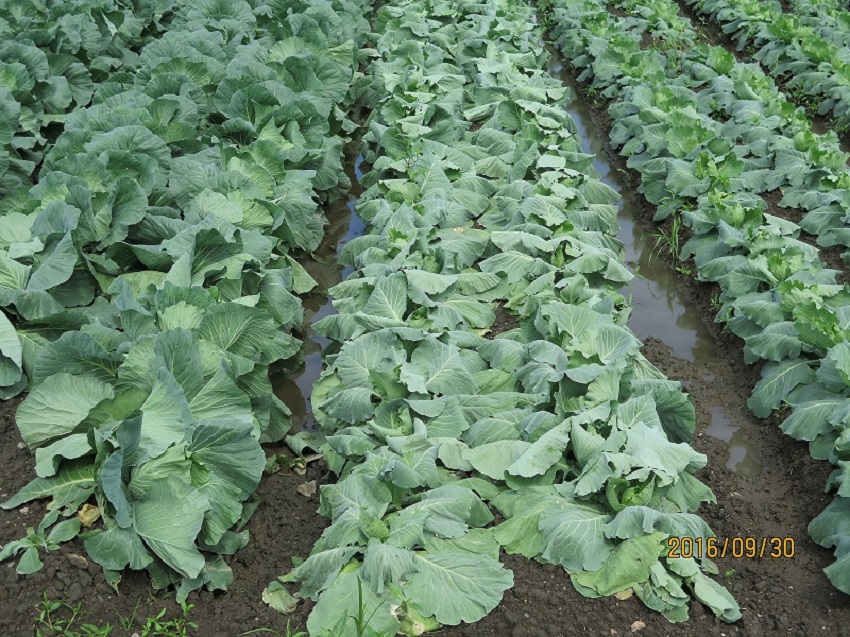 当産地のキャベツは水田で栽培されるため、軽度ではあるが湿害を受け、生育も遅れた。(撮影9月30日:大中の湖、著しい湿害を受けた圃場) ・中上段:降雨が収まると生育も回復し、圃場は十分に管理され、病虫害、雑草の発生も僅かである。(撮影10月21日:大中の湖) ・中下段:湿害を受けたため、株ごとの生育のばらつきが大きい。 野菜価格高騰で出荷が急がれており、収穫可能な株を探しながら間引き収穫されている。(撮影10月21日:大中の湖) ・下段:JA集荷場に持ち込まれたキャベツ(市場出荷用)。 この時期として例年と比較し、量的にかなり少ない。(撮影10月21日) | ||||||
