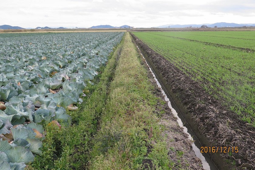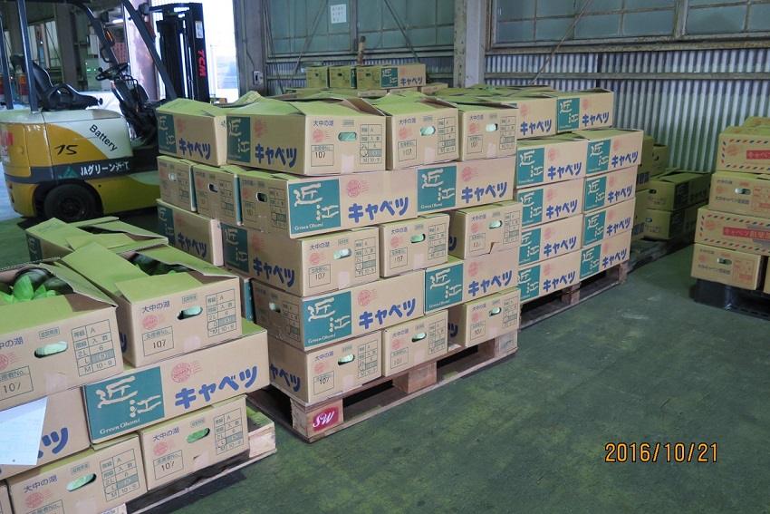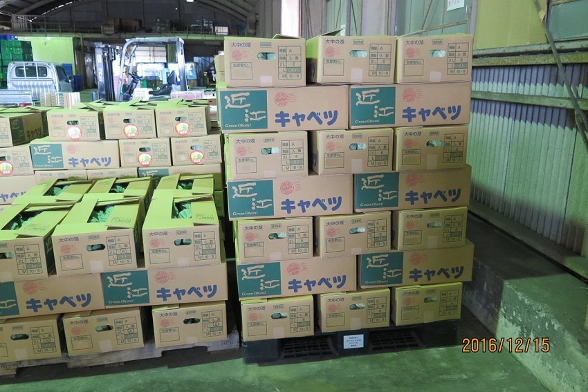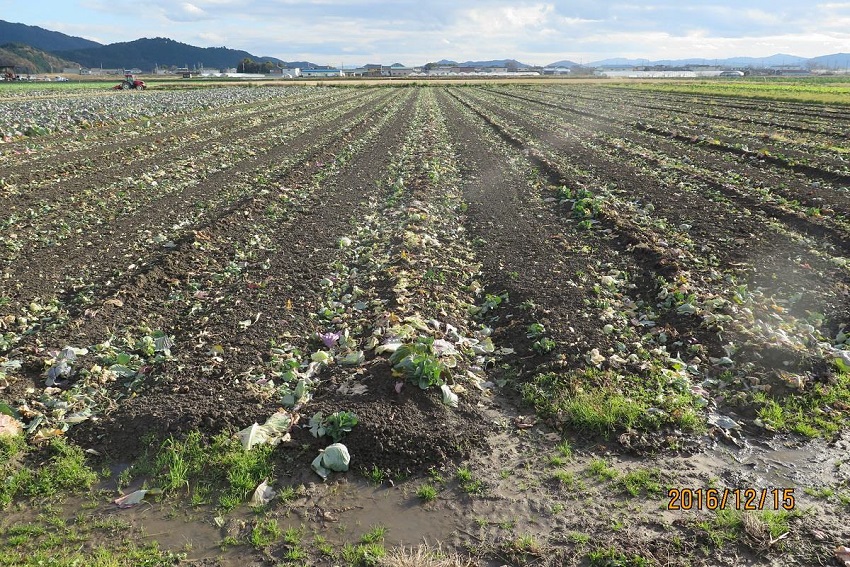 12月上旬の寒波を受け、アントシアニンが出てきたが、支障はない。 (撮影12月5日:大中の湖、1月収穫を待つキャベツ) ・中上段:滋賀県ではほとんどのキャベツが水田で栽培される。 降雨の影響を受けやすいので、排水対策が十分にされている。 (撮影12月15日:大中の湖、小麦と隣り合わせで栽培されるキャベツ) ・中下段:JA集荷場に持ち込まれたキャベツ(市場出荷用) 8玉/ケースが中心であるが、6玉/ケースも多くなってきた。 撮影時間が午後3時頃なので、集荷量はまだ少ない。(撮影12月15日) ・下段:11月に収穫を終えた圃場は耕耘されている。 滋賀県では水稲栽培と組み合わせることにより、連作障害の回避を図っているため、この圃場も来年は水稲が作付けられる可能性がある。 (撮影12月15日:大中の湖) | ||||||